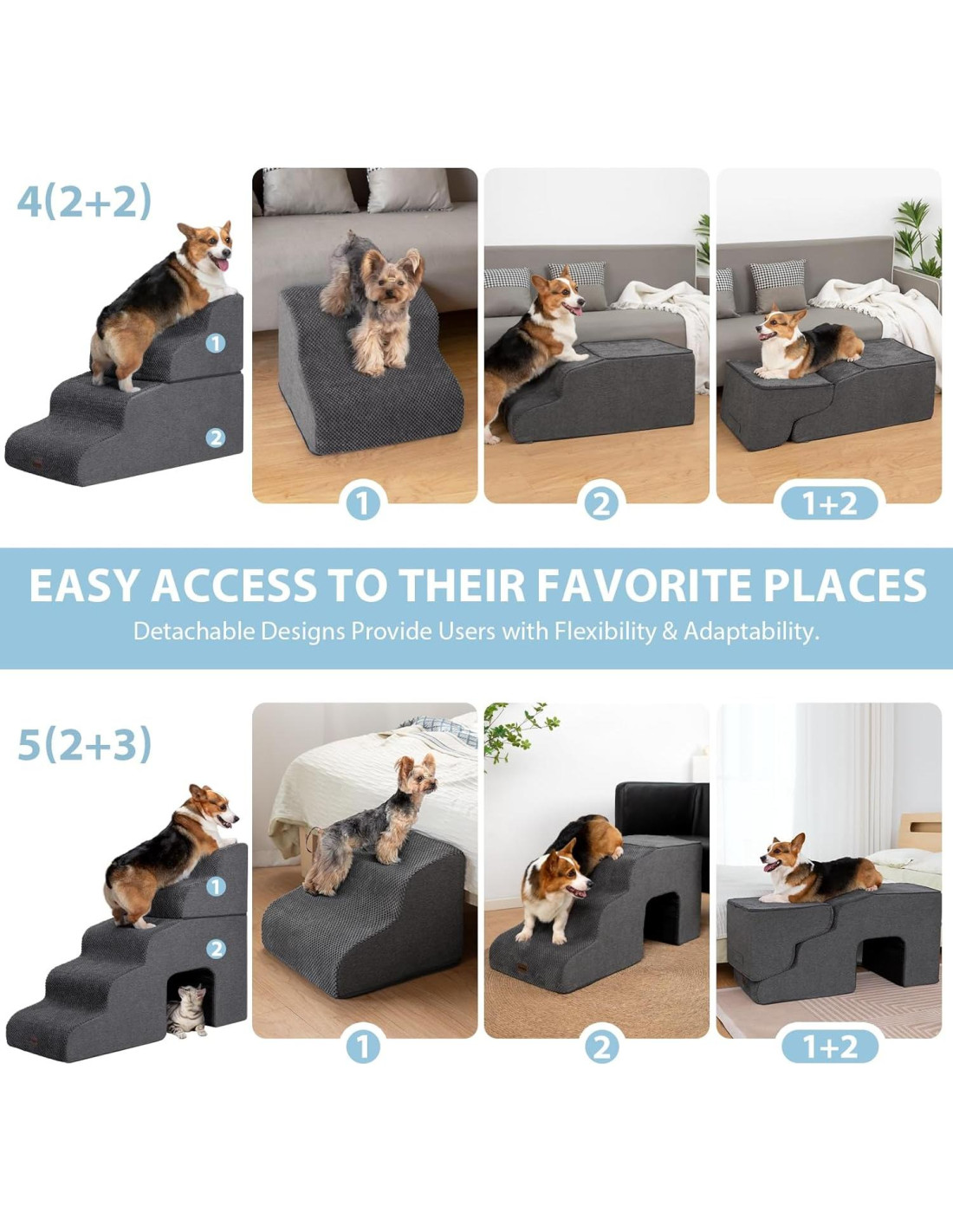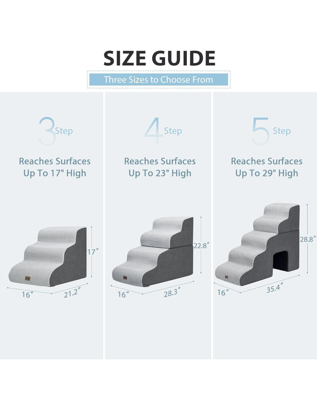 - MÚLTIPLES TAMAÑOS DE ESCALONES: Esta escalera para mascotas tiene 3, 4 y 5 escalones para elegir. Nuestras escaleras de 3 escalones se adaptan a sillas/sofás/camas de hasta 50.8 cm. Las escaleras de 4 escalones se adaptan a sillas/sofás/camas de hasta 60.96 cm. Y las escaleras de 5 escalones con un agujero para que las mascotas jueguen se adaptan a sillas/sofás/camas de hasta 71.12 cm.