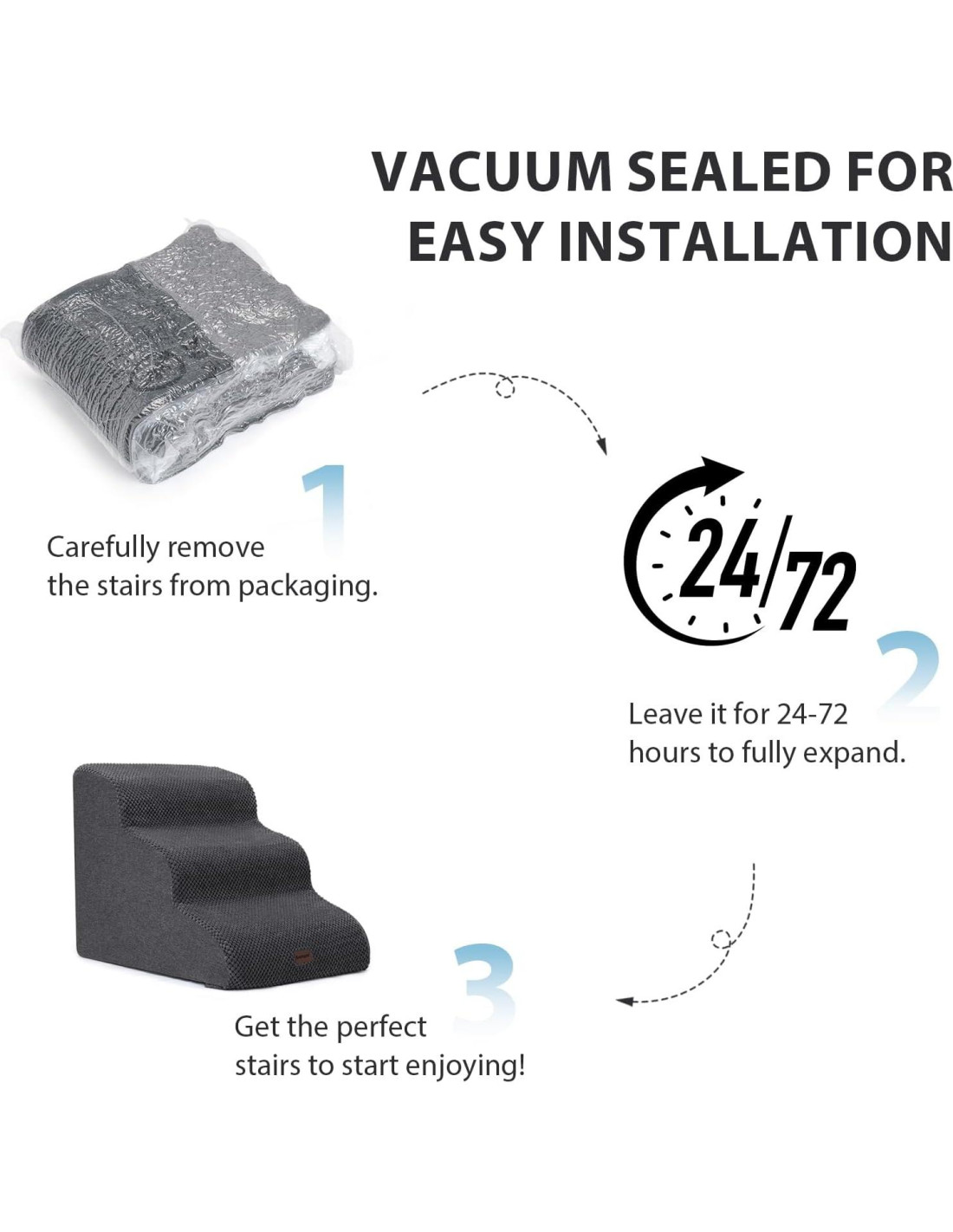 - NOTA ESPECIAL: Nuestras escaleras para perros están comprimidas al vacío. Abre todos los paquetes antes de usar, permitiendo que la esponja entre en contacto con el aire. Puede tardar 72 horas en recuperarse. Espera pacientemente hasta que el producto vuelva a su forma normal.