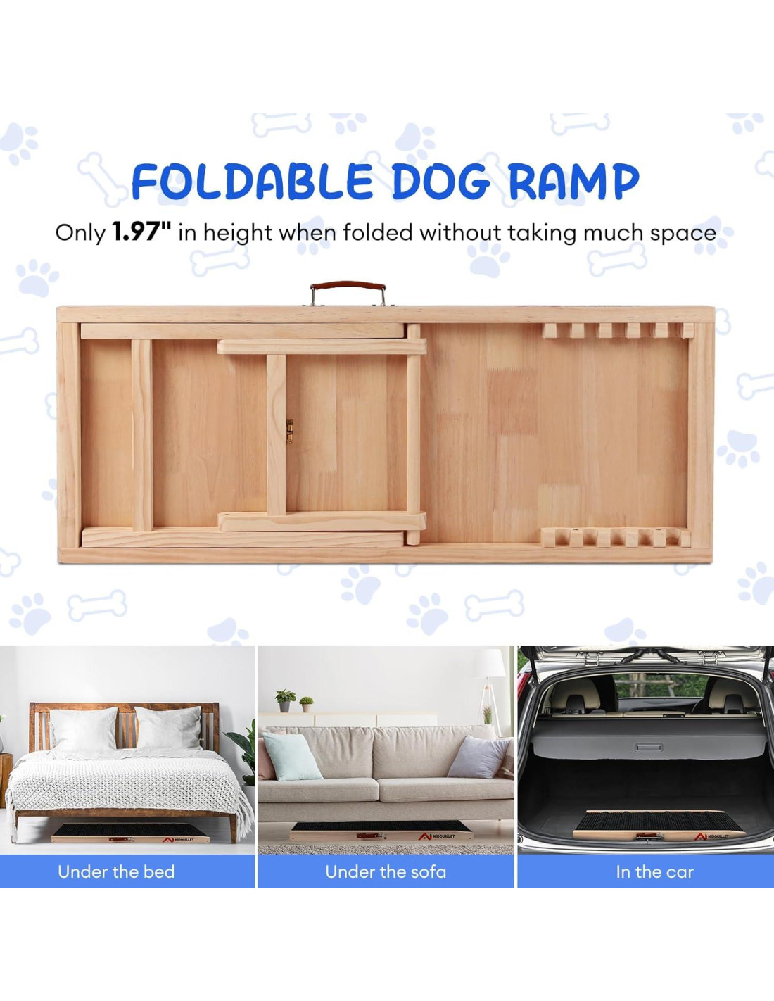 - Robusta y Alta Estabilidad - La rampa para perros plegable está hecha de madera natural, superficie suave, y no rasguña tus manos. La construcción de madera sólida y la tira de madera móvil extra larga ofrecen un fuerte soporte, asegurando que la escalera para perros sea lo suficientemente estable para soportar mascotas de hasta 90 kg.