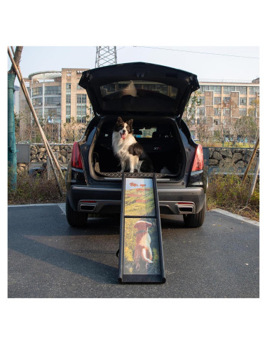- Rampa Portátil para Perros para Auto - Sin Necesidad de Montaje - Se configura instantáneamente sin herramientas - simplemente despliega y extiende para uso inmediato. El diseño ligero (5.2kg) se pliega de manera compacta a 79cm x 40cm x 19cm con mangos integrados, lo que la hace ideal para viajes, actividades al aire libre y almacenamiento en espacios reducidos de vehículos.