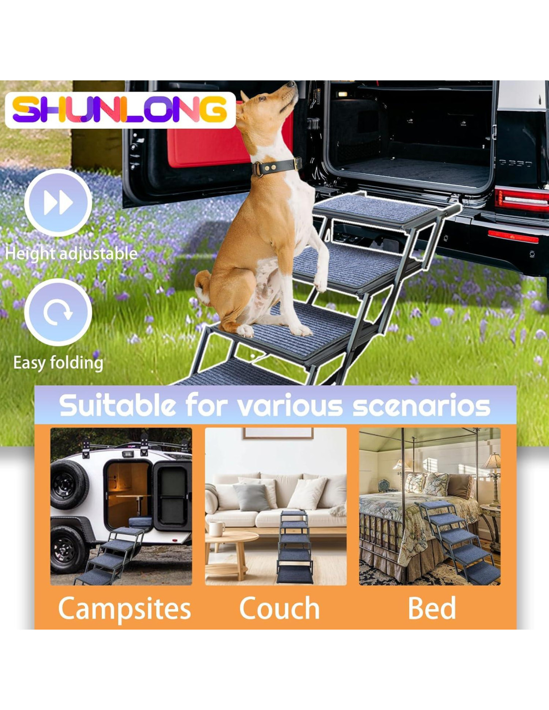 - Fácil de Usar y Versátil: Las escaleras para mascotas grandes están diseñadas para una amplia gama de usos, desde el hogar hasta los viajes. Se adaptan a la mayoría de los vehículos, incluidos coches, camiones y SUV, lo que las hace perfectas para uso tanto en interiores como en exteriores.