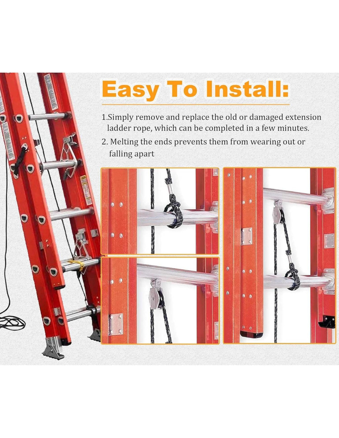 - La cuerda de reemplazo de escalera de extensión se utiliza para bloquear los peldaños de la escalera. Cuando la cuerda de tu escalera de extensión está vieja y podrida, tu escalera no funcionará correctamente y reducirá en gran medida la seguridad.