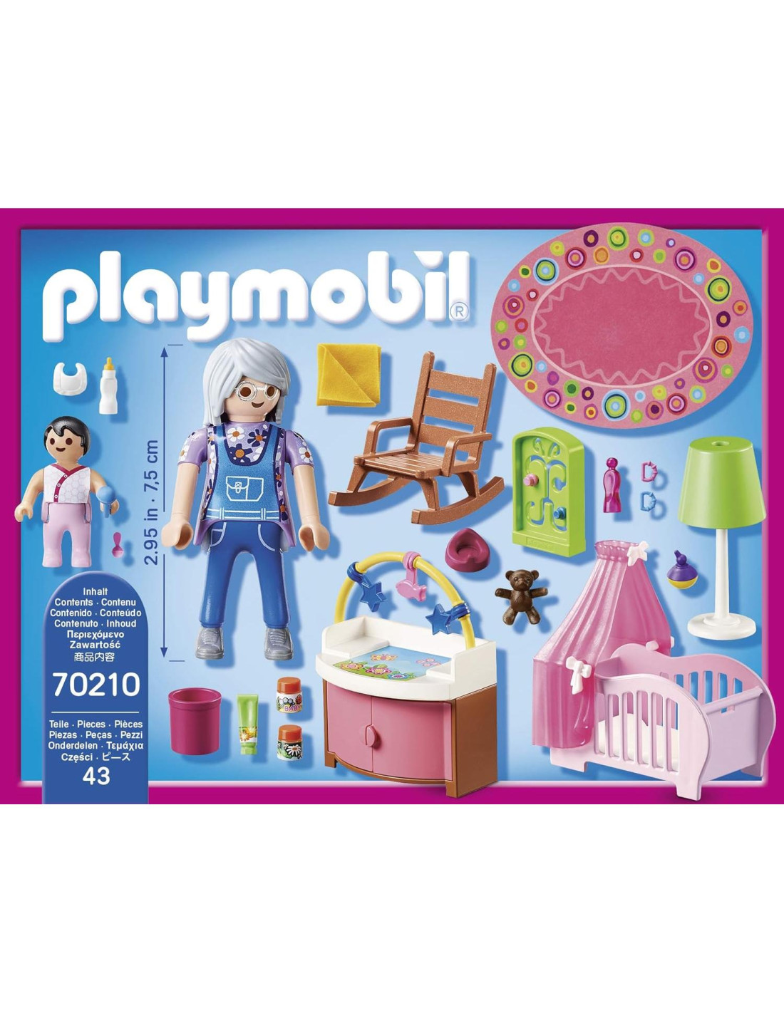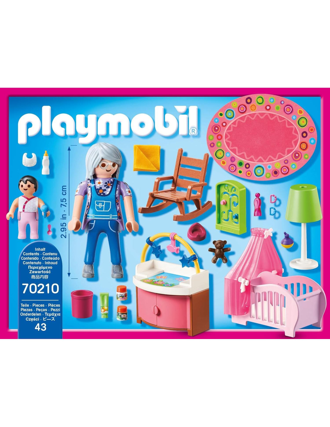 Coloca al bebé para una siesta en la guardería. Observa cómo la abuela mece amorosamente al bebé en la mecedora y le canta sus canciones de cuna antes de ponerlo a dormir en la cuna. Una vez despierto, el bebé puede ser cambiado en la mesa de cambio y jugar con los juguetes en la alfombra. El set incluye una figura adulta, una figura de bebé, cuna, mesa de cambio, lámpara, sonajeros, biberón, toallas, alfombra de juego y muchos otros accesorios. Combina este set con la Casa de Muñecas Grande (70205 - se vende por separado) para más diversión. Recomendado para mayores de cuatro años. Advertencia. Peligro de asfixia. Contiene una bola pequeña y piezas pequeñas. No apto para niños menores de 3 años.