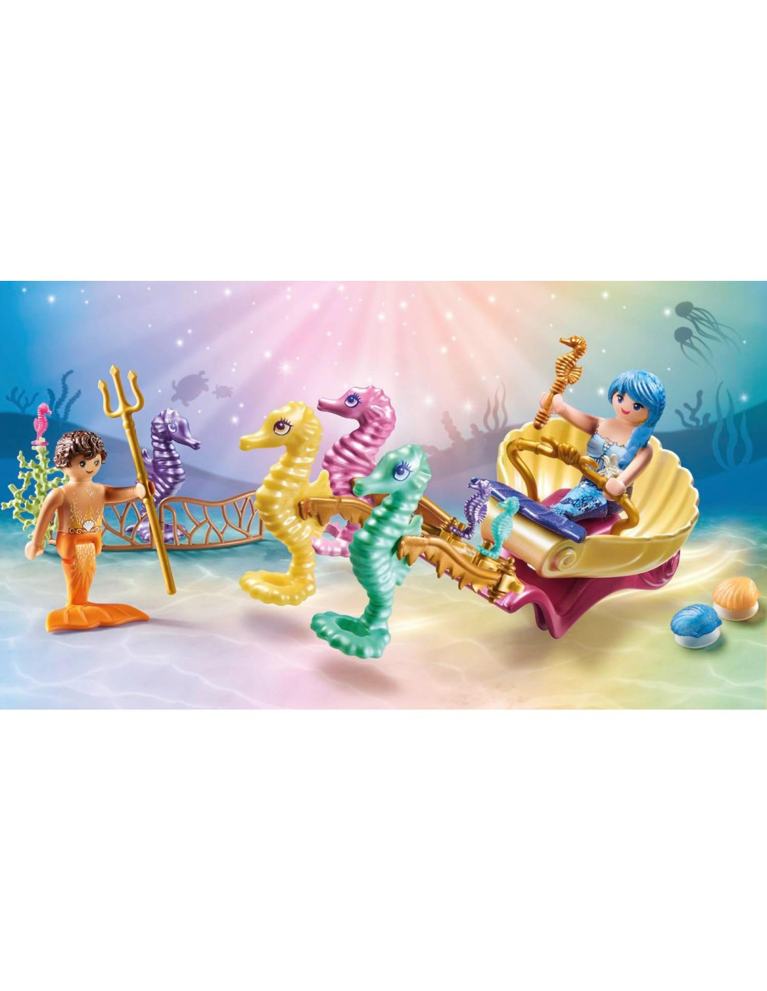 Haz un paseo bajo el mar en la elegante Carroza de Caballo de Mar. La sirena se dobla fácilmente para sentarse en la concha y los coloridos caballos de mar se conectan a la carroza y nadan hacia el mar. Cuando la aventura haya terminado, ¡no olvides alimentar a los caballos de mar con su cena! Conecta fácilmente las conchas a cualquier superficie lisa usando las ventosas. Para más diversión mágica de sirenas, combina este juego con otros sets de PLAYMOBIL de sirenas (#71499, 71501-71503 - se venden por separado). El set incluye dos figuras, carroza concha, cuatro caballos de mar y otros accesorios. Recomendado para edades de cuatro a diez años. Advertencia. Peligro de asfixia. Piezas pequeñas. No apto para niños menores de 3 años.