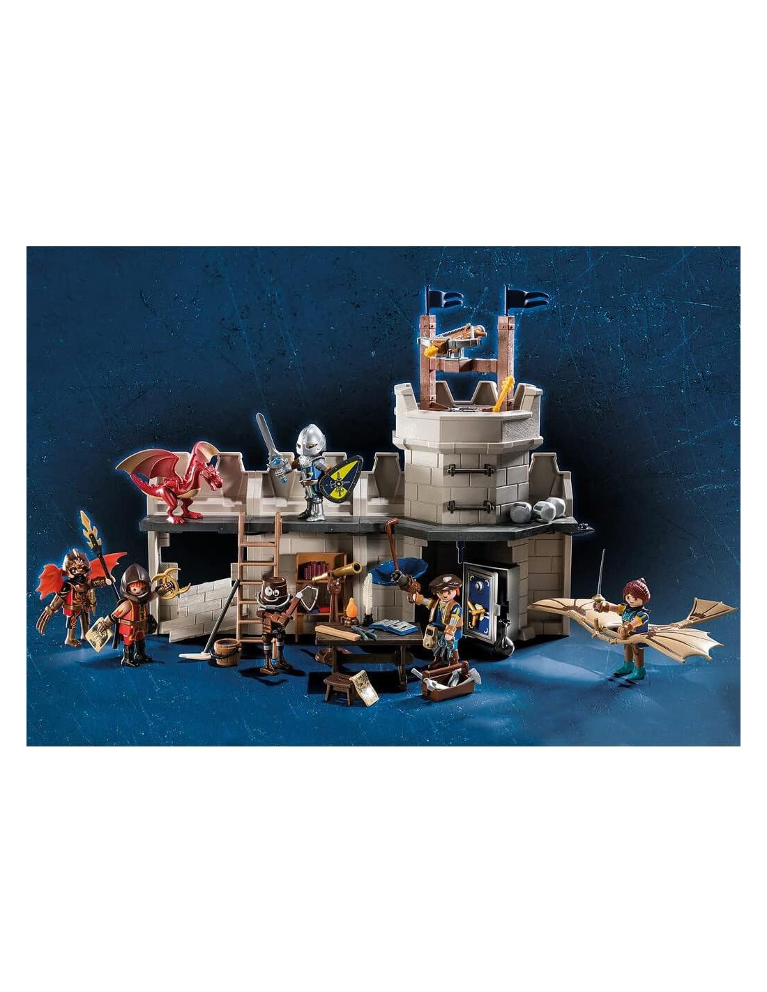 Celebra una Navidad Caballeresca con este Calendario de Adviento temático de Novelmore. Desbloquea el taller secreto del inventor de Novelmore, Dario Da Vanci, y revela sus invenciones exclusivas detrás de las 24 puertas que conducen a la Navidad. Observa cómo Gwynn usa el ala delta para defender el reino de los Burnham Raiders mientras Arwynn bloquea bolas de fuego con su paraguas de fuego. La muralla del castillo con torre está equipada con una ballesta funcional y una pared de ruptura. Conecta la torre al Gran Castillo de Novelmore y a la Fortaleza de Novelmore (70220 y 70222 - cada uno se vende por separado). El set incluye torre, cinco figuras, dragón, paraguas de fuego, armadura de ala delta, mesa, taburete, varias herramientas y otros accesorios. Recomendado para edades de 4 a 10 años. Advertencia. Peligro de asfixia. Contiene una bola pequeña y piezas pequeñas. No apto para niños menores de 3 años.