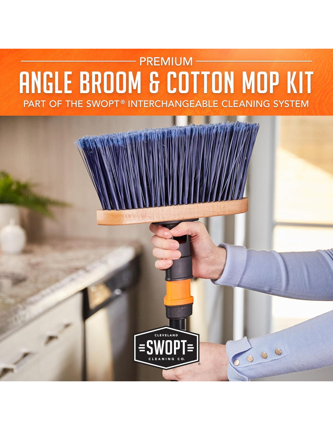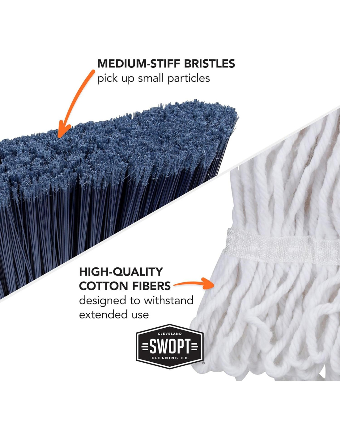 - PAQUETE COMBO - Las cerdas de rigidez media hacen que esta cabeza de escoba sea perfecta para usar en interiores o exteriores. Captura polvo y escombros en las esquinas con el ángulo. Incluye mop de algodón SWOPT y Mangos de Agarre de Espuma EVA de 48" (121.92 cm) y 60" (152.4 cm).
