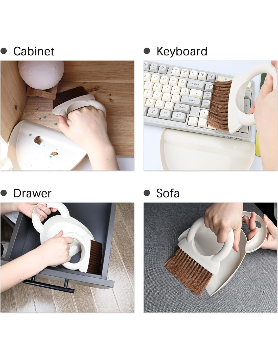 - [Ampliamente Utilizado] : Un juego de escoba y recogedor pequeño puede limpiar el desorden en áreas pequeñas como arena para gatos, cocinas, mesas, encimeras, automóviles, baños, etc. Barre eficientemente migas, suciedad, polvo y cualquier otro desecho no deseado.