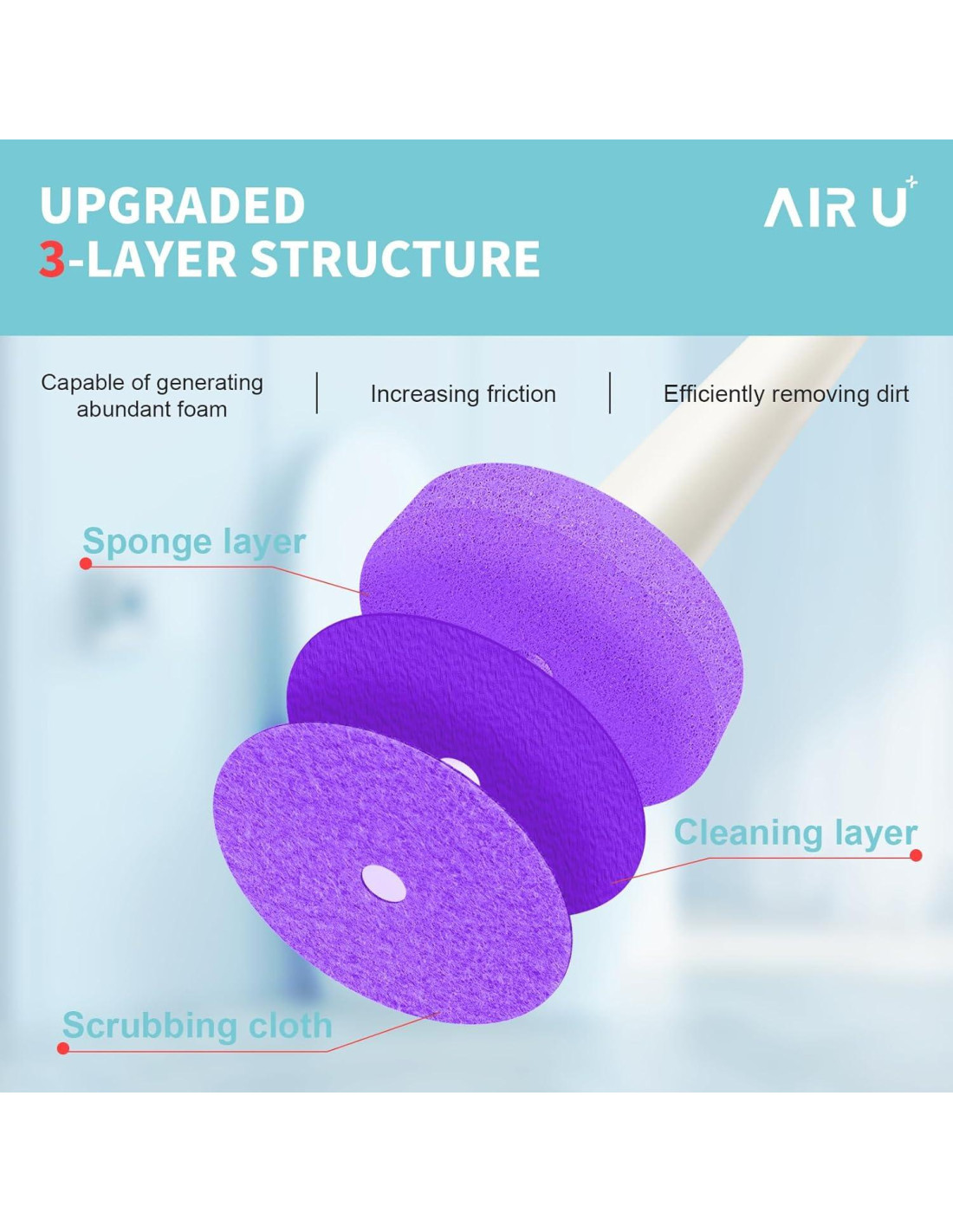 - Diseño de tres capas: Estas cabezas de cepillo de inodoro desechables están compuestas por una capa de esponja absorbente de agua, una capa de solución de limpieza soluble y una tela de fregado suave. Sin limpieza de ángulos muertos, la cabeza del cepillo puede rotar para limpiar bordes de difícil acceso.