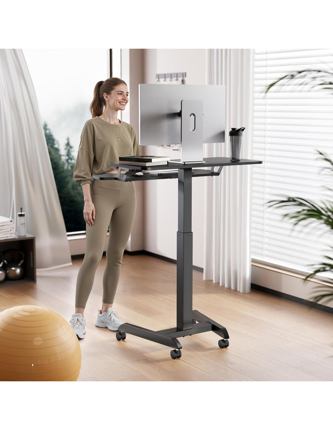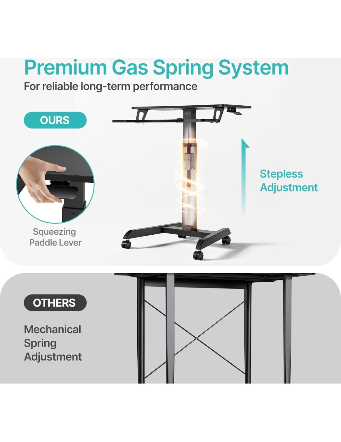 - [Ajustes de Altura Sin Esfuerzo] Este escritorio de pie móvil con ruedas se puede elevar o bajar sin esfuerzo con una mano, sin herramientas requeridas. El resorte de gas ha soportado 20,000 pruebas, soportando de manera confiable hasta 8.2 kg. Ya sea escribiendo, de pie brevemente, o deslizándolo hacia atrás como un escritorio móvil para estudiar, la base reforzada en I y la construcción de metal engrosado crean una sensación sólida y anclada, asegurando durabilidad a largo plazo.