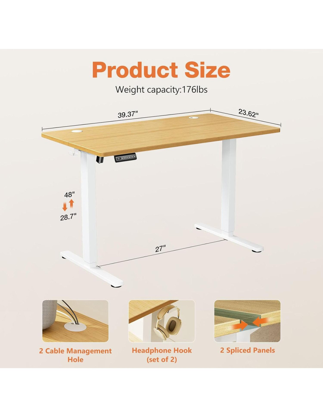 - Nombre del tipo de artículo: Escritorio de oficina en casa de 40x24 pulgadas (101.6x61 cm) con 3 presets de memoria, tablero de madera en espiga, marco de metal, roble