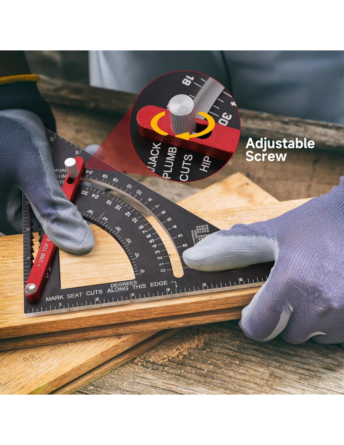 - Escuadra Ajustable Multiusos: Herramienta de escuadra de techo para medir ángulos y guía de sierra para cortar. El transportador se puede usar con la sierra cuadrada para cortes transversales o en inglete. La escuadra combinada mide o marca ángulos de 0 a 90 grados muy rápidamente y también se puede usar como guía de sierra para cortes de 45 y 90 grados.
