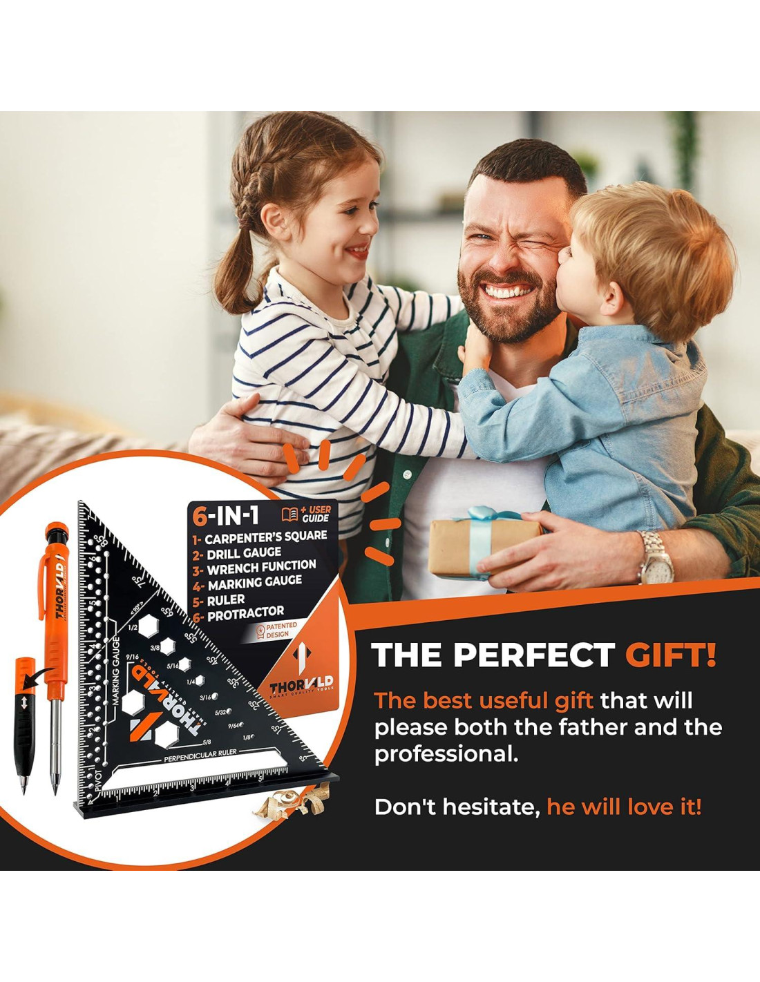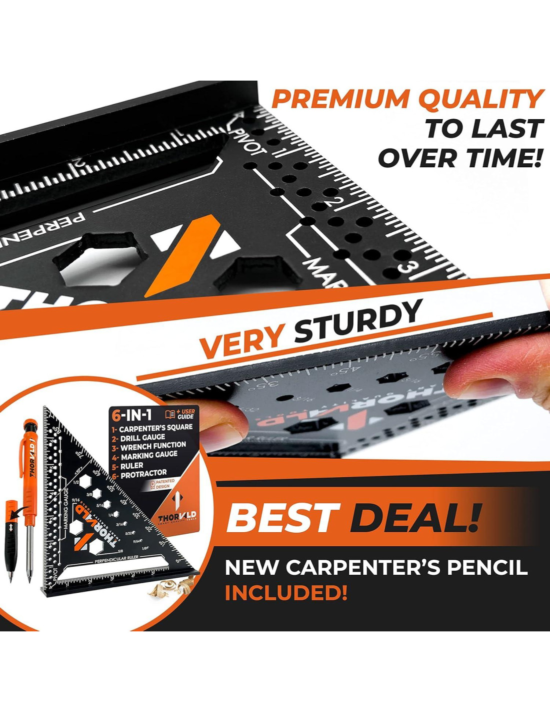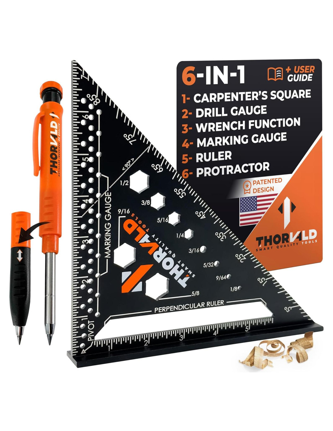 - TRABAJA MÁS RÁPIDO Y INTELIGENTE - Ahorra tiempo precioso en la carpintería con nuestra nueva escuadra de cumbrera. ¡Mide, traza y toma ángulos fácilmente usando solo una escuadra de carpintero! No necesitas llevar una caja de herramientas voluminosa. Con nuestras herramientas de carpintero 6-en-1, ¡tienes todo lo que necesitas para trabajar rápida y eficientemente!