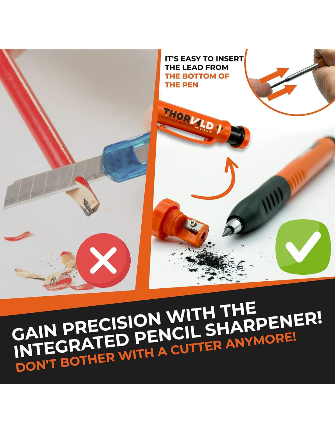 - LÁPIZ DE CARPINTERO INCLUIDO - Gracias a nuestro nuevo lápiz de carpintero 2-en-1, ¡finalmente amarás escribir con un bolígrafo de obra! Presenta un agarre removible, lo que te permite escribir con total comodidad. El agarre removible también te permite cambiar al modo de marcador de agujeros profundos en un instante.