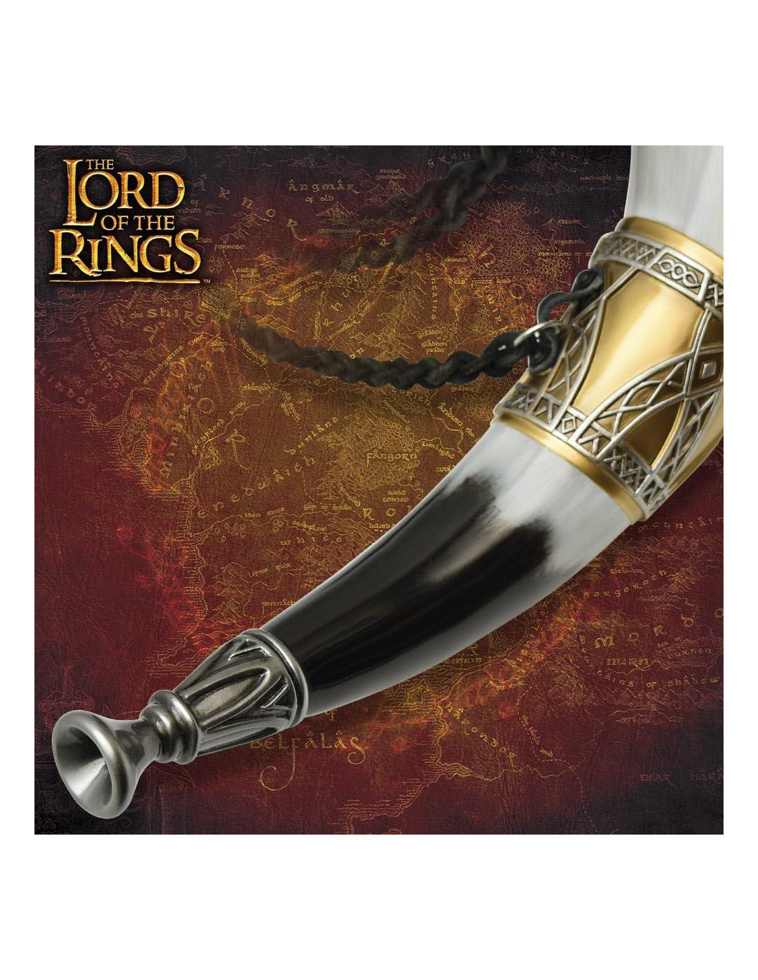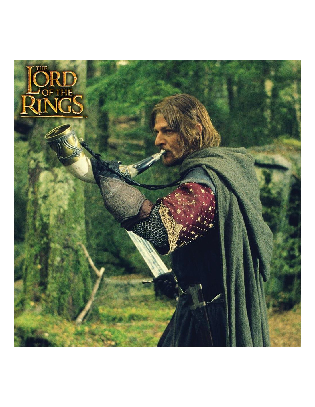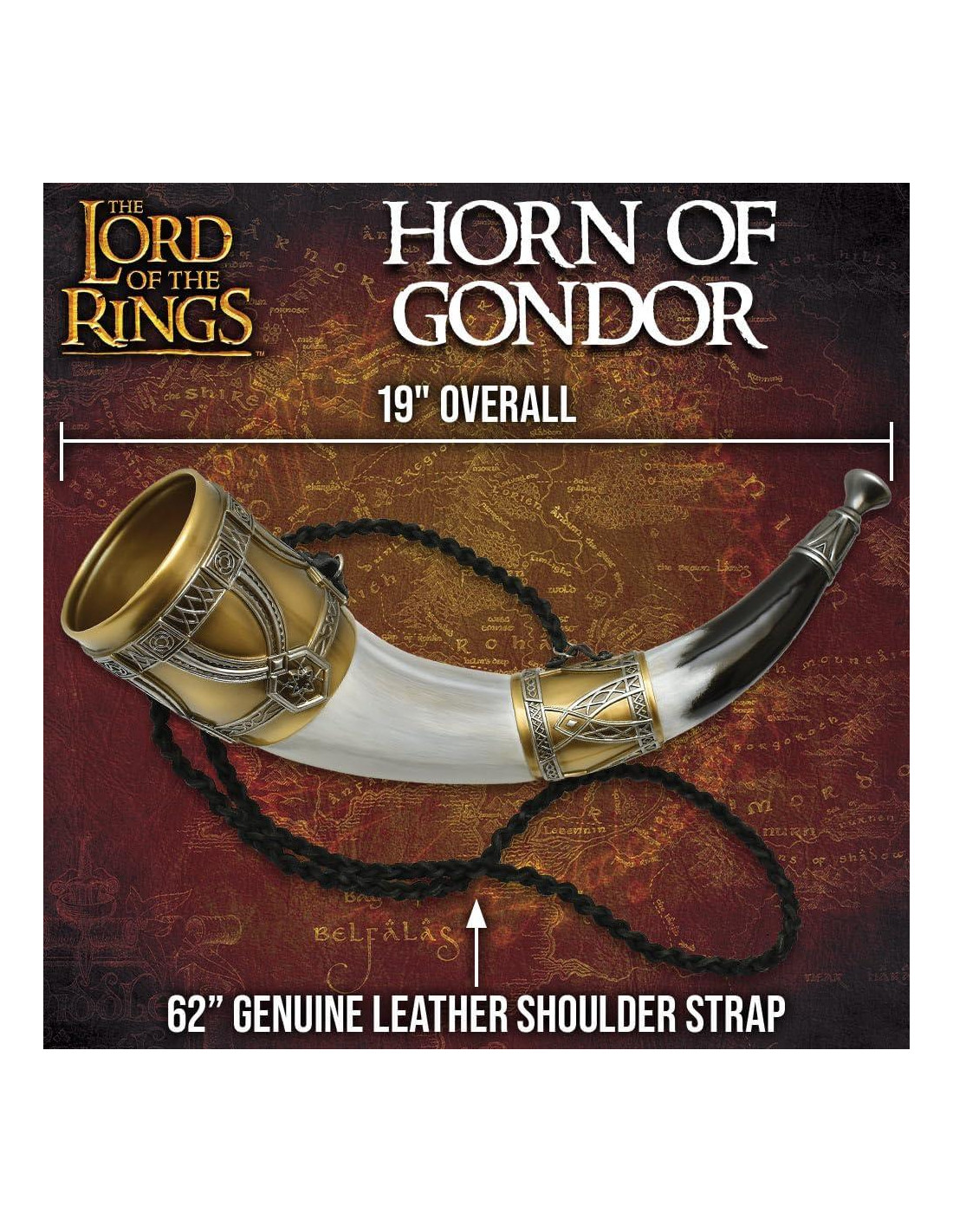 Transpórtate al corazón de la heroica historia de Gondor con la réplica del Cuerno de Gondor. Elaborada con la máxima atención al detalle, esta impresionante reproducción captura fielmente el espíritu de Boromir, el valiente guerrero que sonó el cuerno en tiempos de peligro. Ya sea exhibida como un símbolo de coraje y honor o llevada con orgullo sobre tu hombro, esta réplica se erige como un testimonio del legado perdurable de la Tierra Media. Completa con un certificado de autenticidad, es un imprescindible para cualquier verdadero fan de la saga "El Señor de los Anillos".