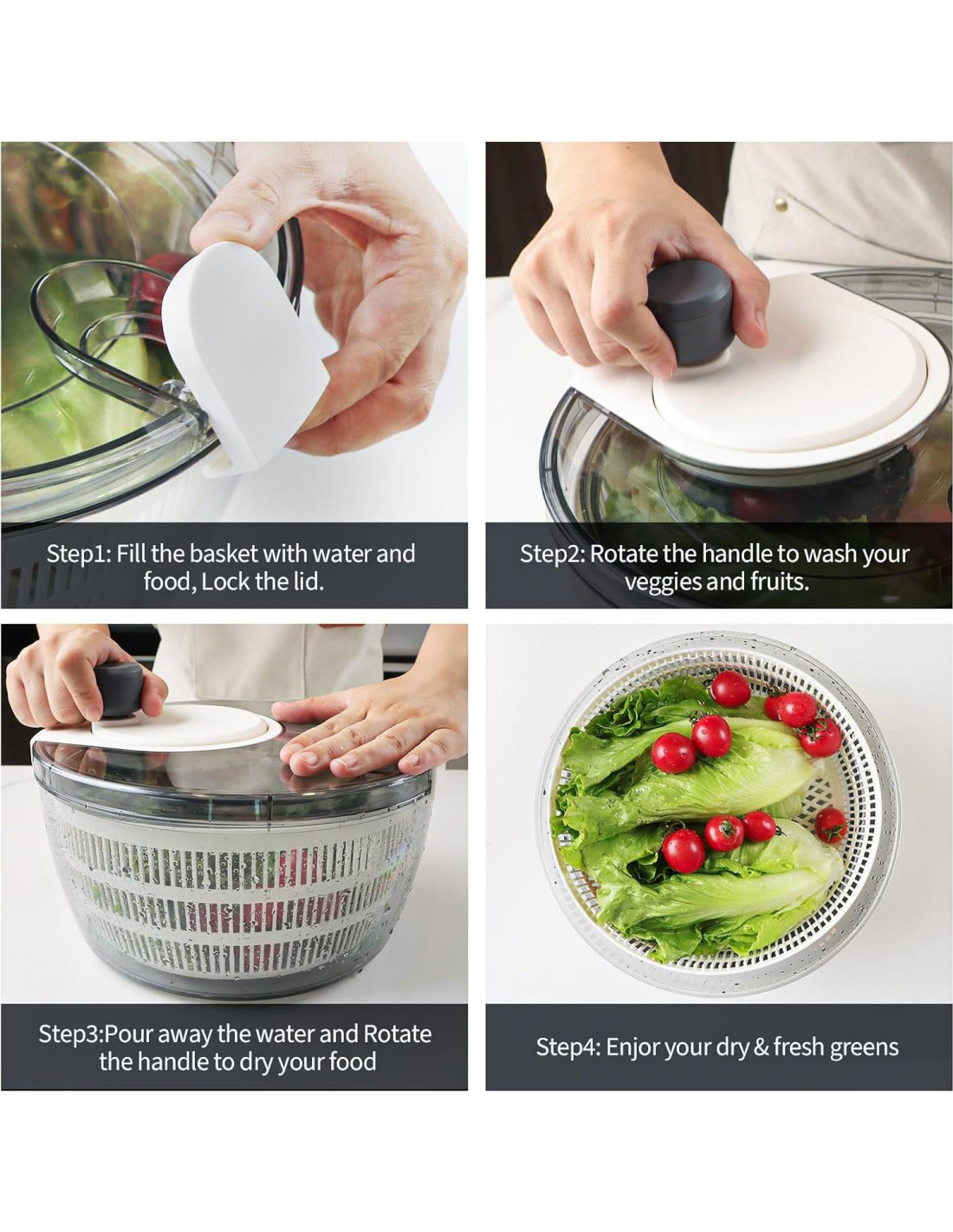 - Versatilidad: La centrifugadora de ensalada multipropósito como secadora, escurridor, crisper, filtro y contenedor, adecuada para verduras de ensalada, hierbas, lechuga, rúcula, espinacas y frutas, etc; perfecta para hacer la preparación de cocina en casa más fácil y rápida.