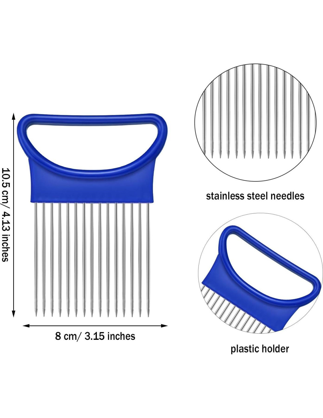 - Material resistente: el sostenedor de cebolla cortador está hecho de plástico y acero inoxidable, inodoro y no tóxico, el acero inoxidable de calidad no es fácil de oxidar, resistente y duradero, lo que puede proporcionar un largo servicio para tu vida de cocina