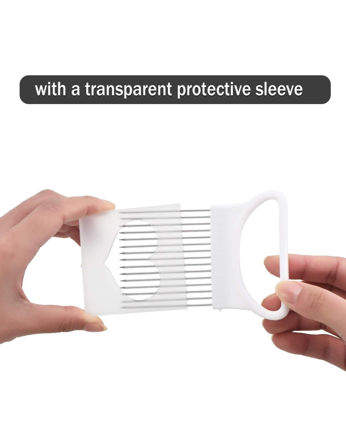 - Sobre el diseño: cada sostenedor de cebolla cortador está equipado con 15 púas y un mango de plástico, lo que permite mantener la cebolla en su lugar para un corte rápido y fácil, mango de plástico grueso y antideslizante, hace que tu sujeción sea más cómoda, además, el sostenedor de cebolla con una funda protectora transparente por fuera, que puede proteger los dedos y las manos de lesiones