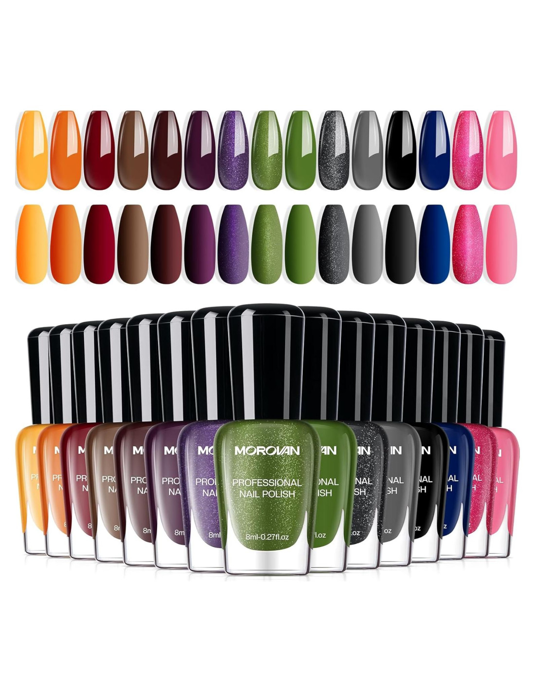 - Tonos Hipnotizantes para Cada Estado de Ánimo: El juego de esmalte de uñas oscuro de Morovan viene en 15 impresionantes tonos góticos como burdeos, marrón, gris, rojo oscuro, verde, púrpura y esmalte de uñas negro brillante, pero también rosa claro brillante, amarillo, esmalte de uñas rosa fucsia para cualquier estado de ánimo u ocasión, desde el código de vestimenta de la oficina hasta festivales como Halloween, Navidad y Pascua, así como fiestas y celebraciones temáticas. ¡También es un gran set de regalo de esmalte de uñas!