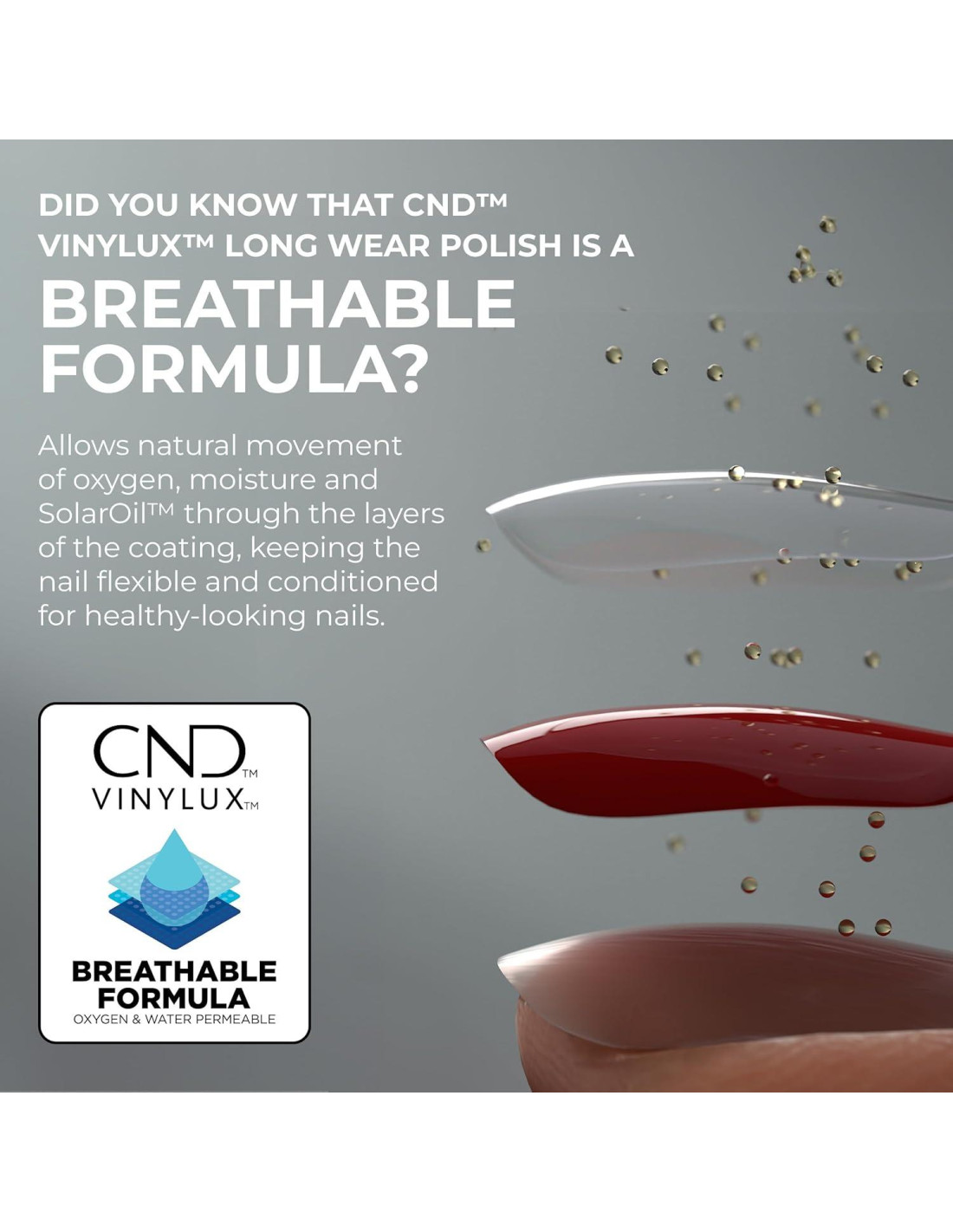 Descripción del Producto El CND VINYLUX Esmalte de Larga Duración y el Top Coat, un sistema de dos pasos, está diseñado de manera única para trabajar juntos sin una base para uñas de alto brillo con un acabado similar al gel en menos tiempo. La tecnología patentada pro light crea una poderosa red de enlaces de polímero entrecruzados que construyen resistencia a astillas y mejoran la durabilidad con la exposición a la luz natural con el tiempo. Tanto los profesionales como los clientes se benefician del tiempo de secado rápido y del uso resistente a astillas durante siete días. Además, los colores de esmalte de larga duración están infusionados con ingredientes que cuidan, incluyendo vitamina E, queratina y aceite de jojoba. Disponible en más de 150 tonos. Historia de la Marca Creative Nail Design, Inc. (CND) es el líder mundial en productos y servicios profesionales para uñas, y los creadores del original CND SHELLAC Esmalte en Gel.