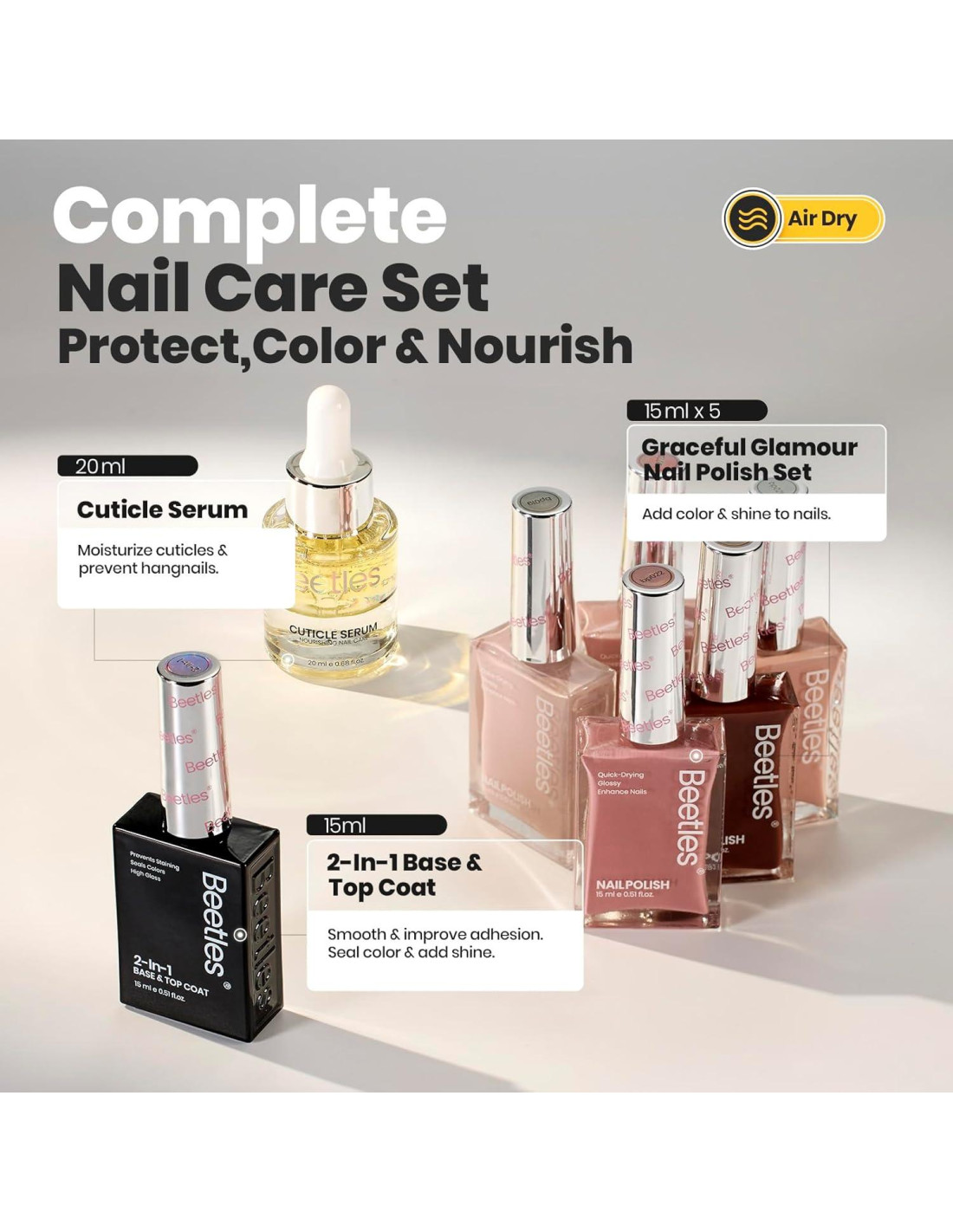 - Kit de cuidado de uñas todo en uno: Este set incluye 5 x 15ml esmaltes de uñas, un base y top coat 2 en 1, y un suero para cutículas de 20ml, ofreciendo un cuidado efectivo para colores vibrantes de uñas y mantenimiento natural de las uñas. Consejo: Usa un ventilador para un secado más rápido en temperaturas bajas.