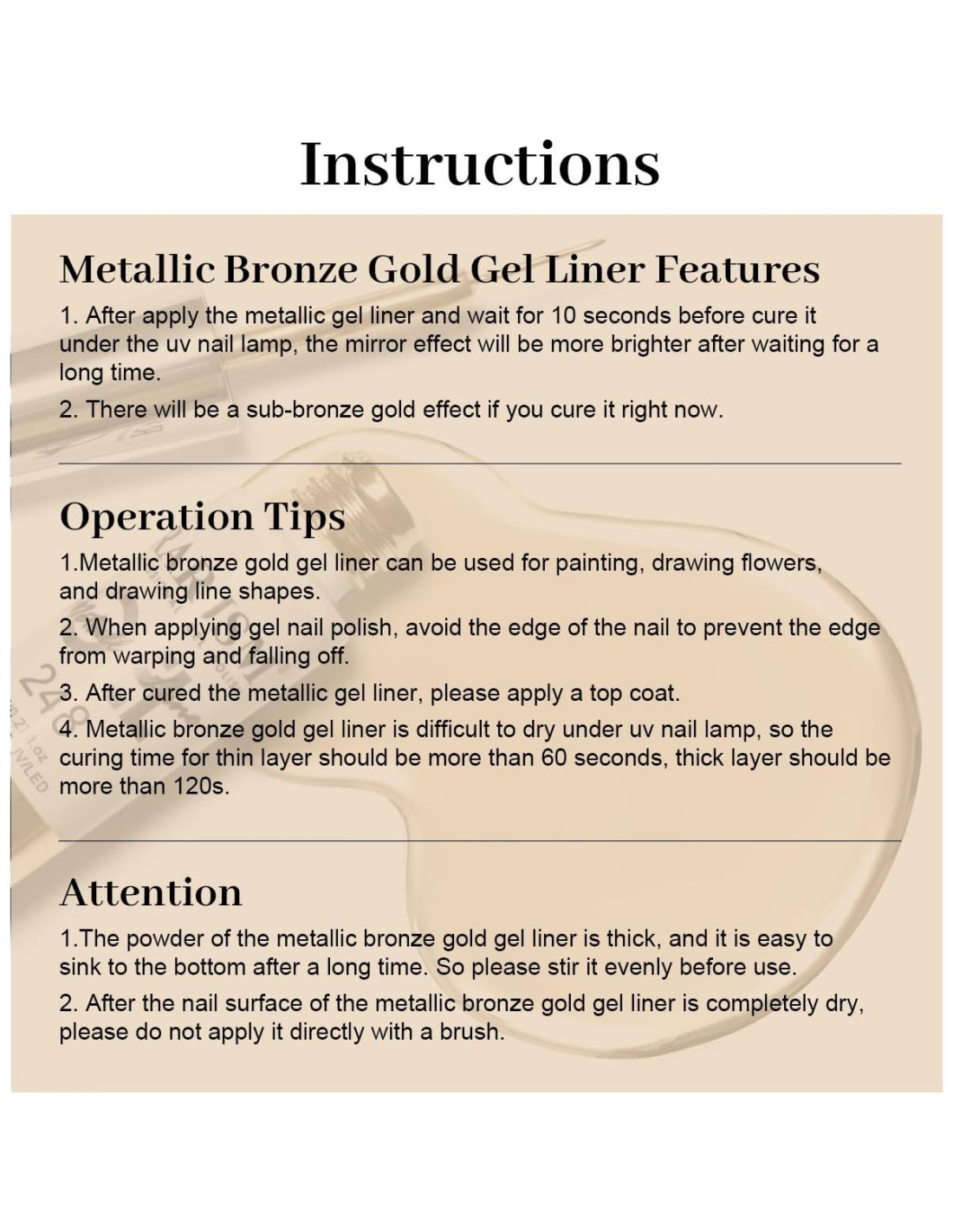 Debido a varios grosores de capa del esmalte de uñas en gel, cualquier diferencia de color de la pantalla del ordenador/móvil y efecto de luz fotográfica, por favor permita una pequeña diferencia de color entre el artículo recibido y las imágenes del producto en la página. Para obtener un buen efecto, recomendamos usar este gel de arte de uñas con base y capa superior que no están incluidos.