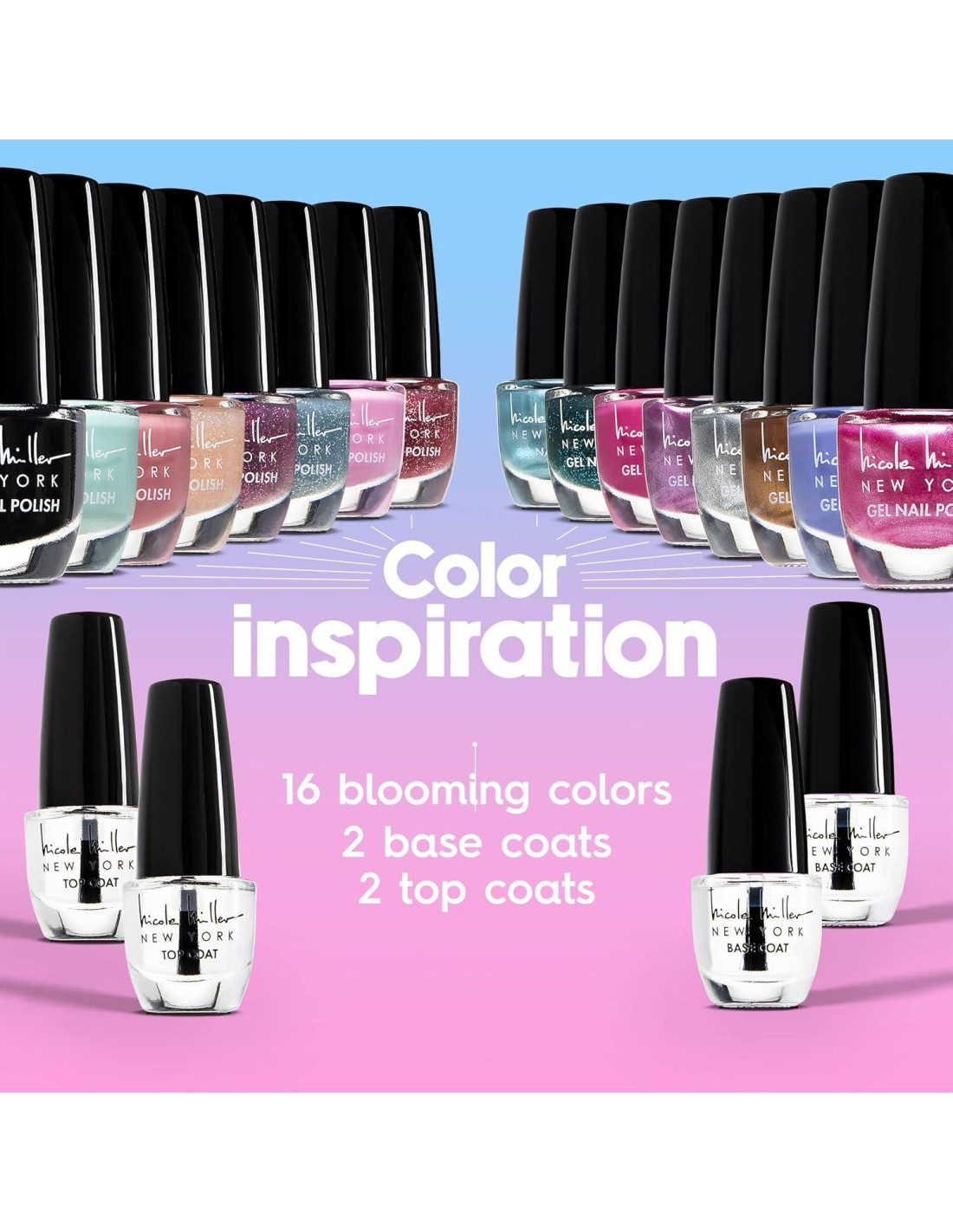 - LO QUE OBTIENES | conjunto de 20 piezas, 16 botellas de esmalte de uñas; todos de diferentes colores, cada uno de 6 ml. 2 botellas de base para que puedas aplicar el esmalte perfectamente. 2 botellas de top coat para un acabado suave. Una caja compacta y hermosa de Nicole Miller.