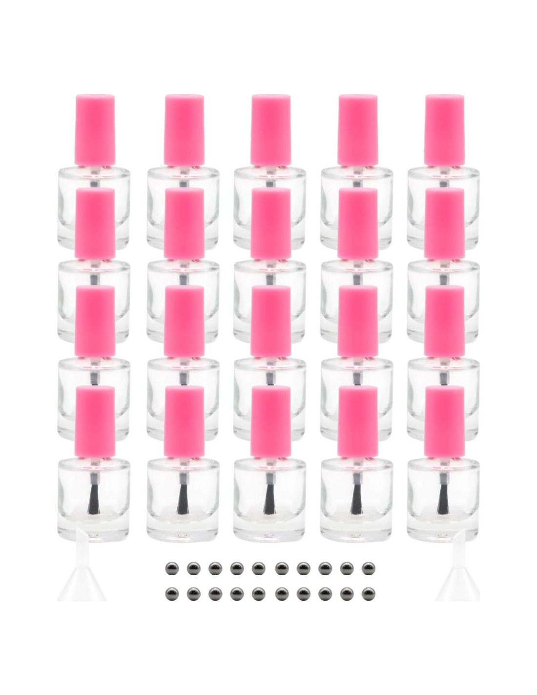 - Capacidad: 8ML; 20 x Botellas de Vidrio Vacías para Esmalte de Uñas; 20 x Bolas de Mezcla; 2 x Embudos
