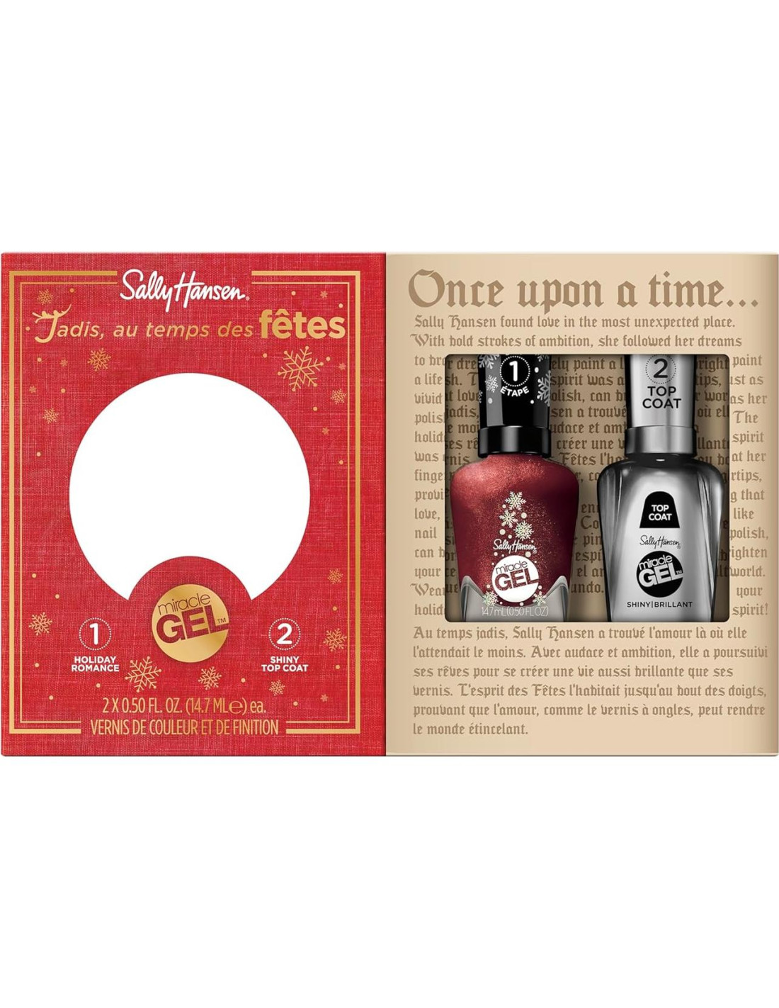 Consiente a tu (s) mismo con Sally Hansen Miracle Gel, una manicura híbrida de gel desde la comodidad de tu hogar. Con un rojo festivo brillante y un Top Coat Brillante para sellarlo, ¡este dúo festivo te enganchará! FÁCIL DE APLICAR EN 2 SIMPLES PASOS 1: Aplica 2 capas de Color Miracle Gel a las uñas limpias y secas. No se necesita base. 2: Una vez seco, aplica 1 capa de Top Coat Miracle Gel para sellar tu manicura hasta por 8 días*. No se requiere lámpara UV, deja que la luz natural haga el resto. *hasta 8 días de color y brillo *los tonos con brillo pueden no tener el mismo rendimiento