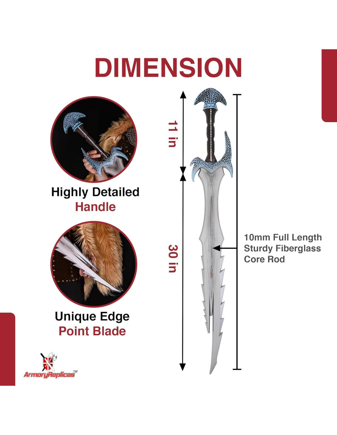 - DIMENSIONES IMPRESIONANTES: Esta espada grande mide una longitud total de 41.25 inches (104,77 cm), con una longitud de hoja de 29 inches (73,66 cm) y un mango cómodo de 12.25 inches (31,12 cm). Su diseño realista se realza con un acabado de laca plateada, negra, marrón, azul y roja.