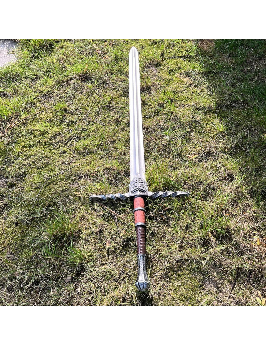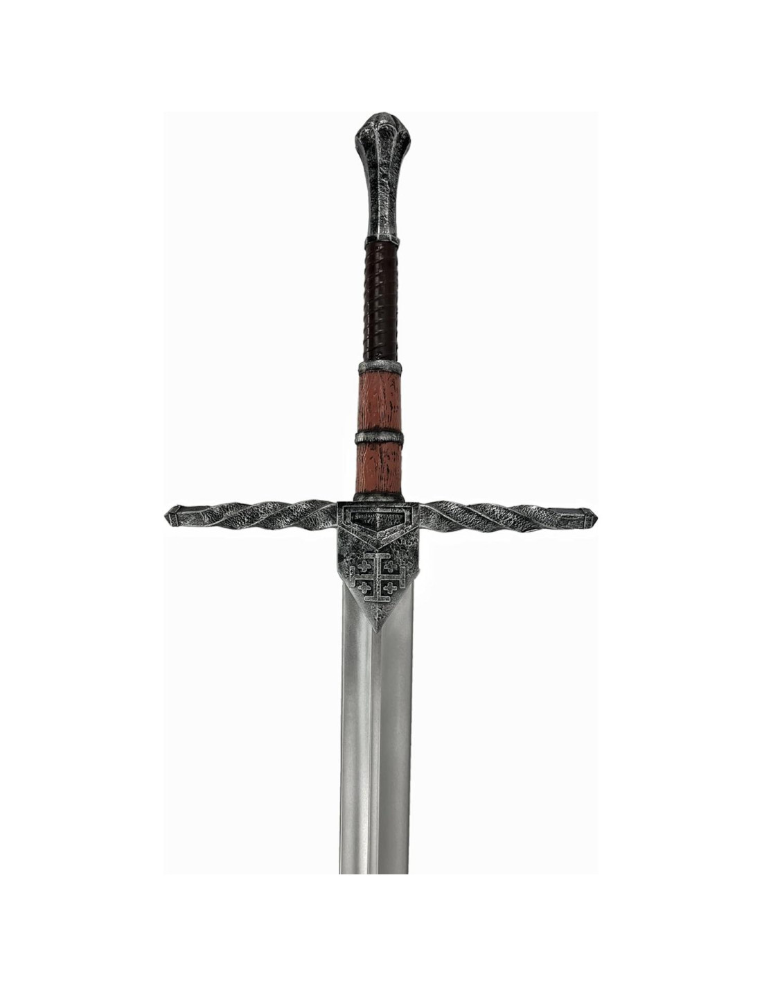 - Sumérgete en el mundo histórico de los caballeros con este prop de espada de dos manos. Inspirada en las grandes espadas de la historia, ha sido cuidadosamente restaurada a su función y uso original. Esta arma se empuñaba típicamente con ambas manos, distinguiéndola de las espadas más pequeñas de una mano. La empuñadura mide 13 pulgadas (33,02 cm) de largo y presenta el emblema del Reino de Jerusalén, convirtiéndola en un emblema de los cruzados.