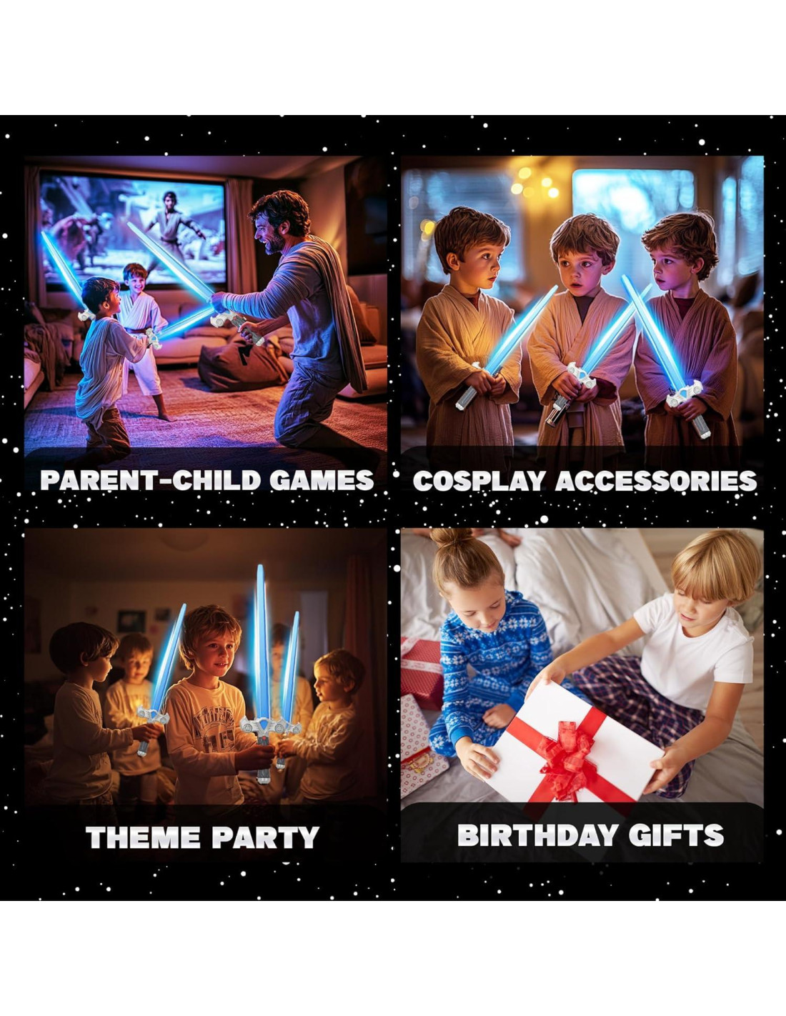- Materiales de Alta Calidad y Seguros: Todos los conjuntos de sables iluminados están hechos de plástico de alta calidad y componentes de alta seguridad, seguros, duraderos, de larga duración y fáciles de usar.