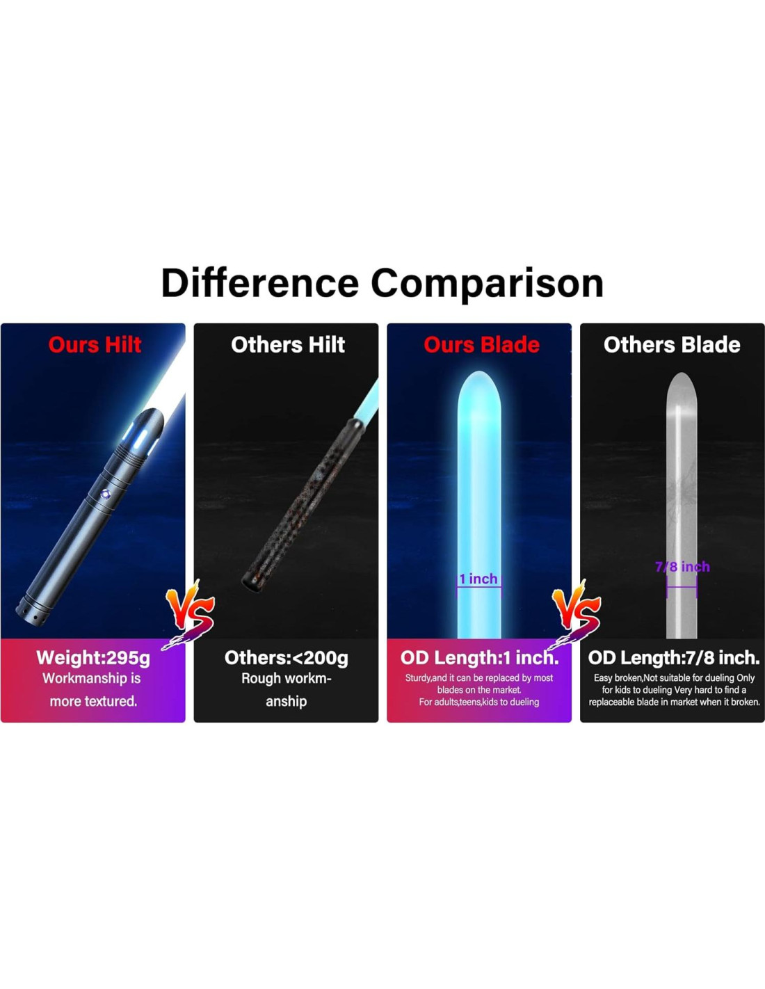 - Por qué elegir los sables de luz ANASABER. En comparación con el mismo tipo de sable de luz en el mercado, hemos mejorado la empuñadura de aleación de aluminio, que es más pesada y tiene más textura. Y nuestras hojas también han sido mejoradas en tamaño y dureza para duelos pesados. El diámetro exterior de nuestra hoja es de 1 inch (2,54 cm) (no el tamaño de 7/8), lo que significa que puedes comprar hojas reemplazables de diferentes longitudes en el mercado para reemplazar, ¡entonces obtendrás un nuevo sable de luz! Así que no es solo para niños, sino también para adolescentes y adultos.