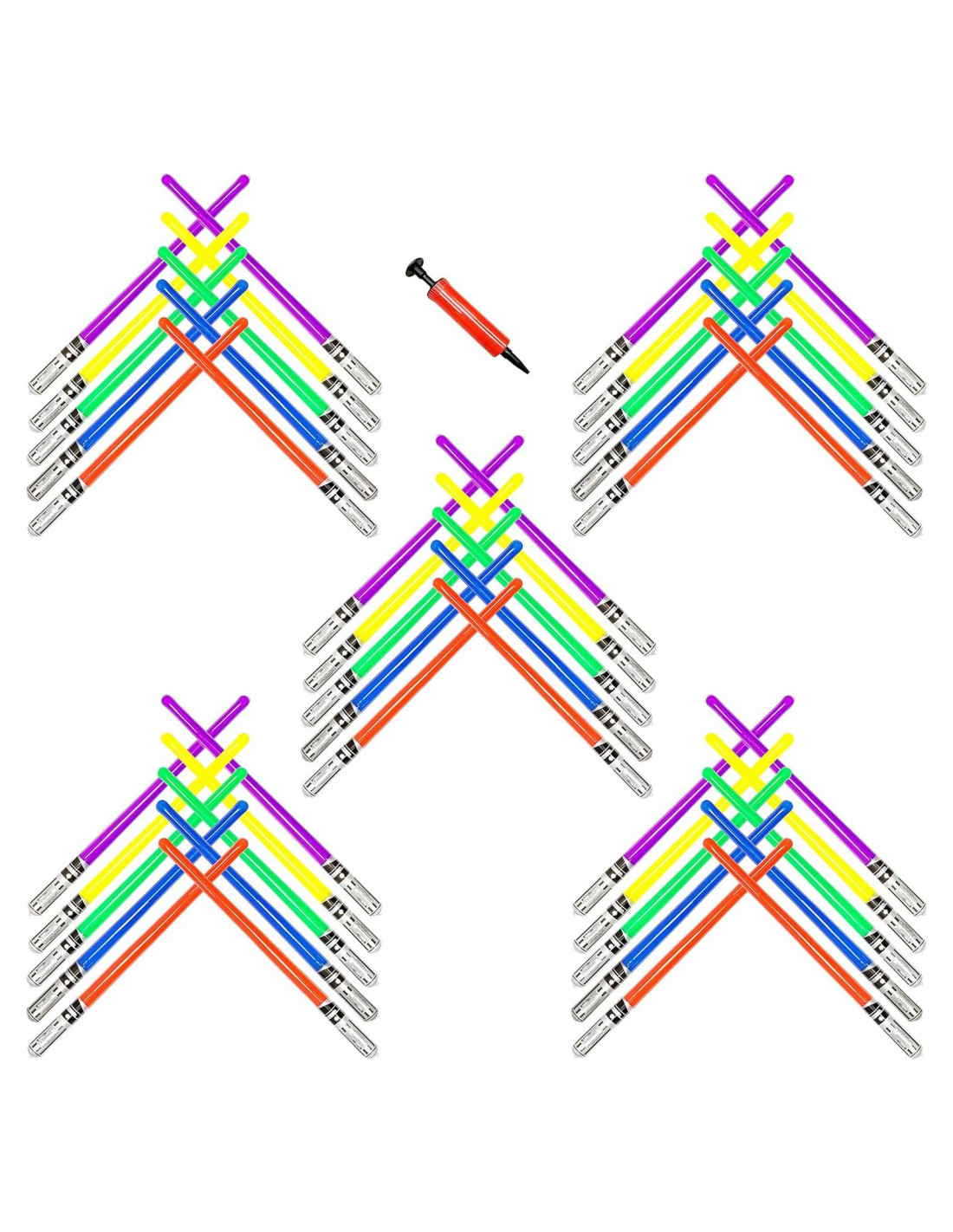 - Paquete de 50 espadas inflables con bomba de aire: 10 verdes, 10 azules, 10 rojas, 10 amarillas y 10 púrpuras
