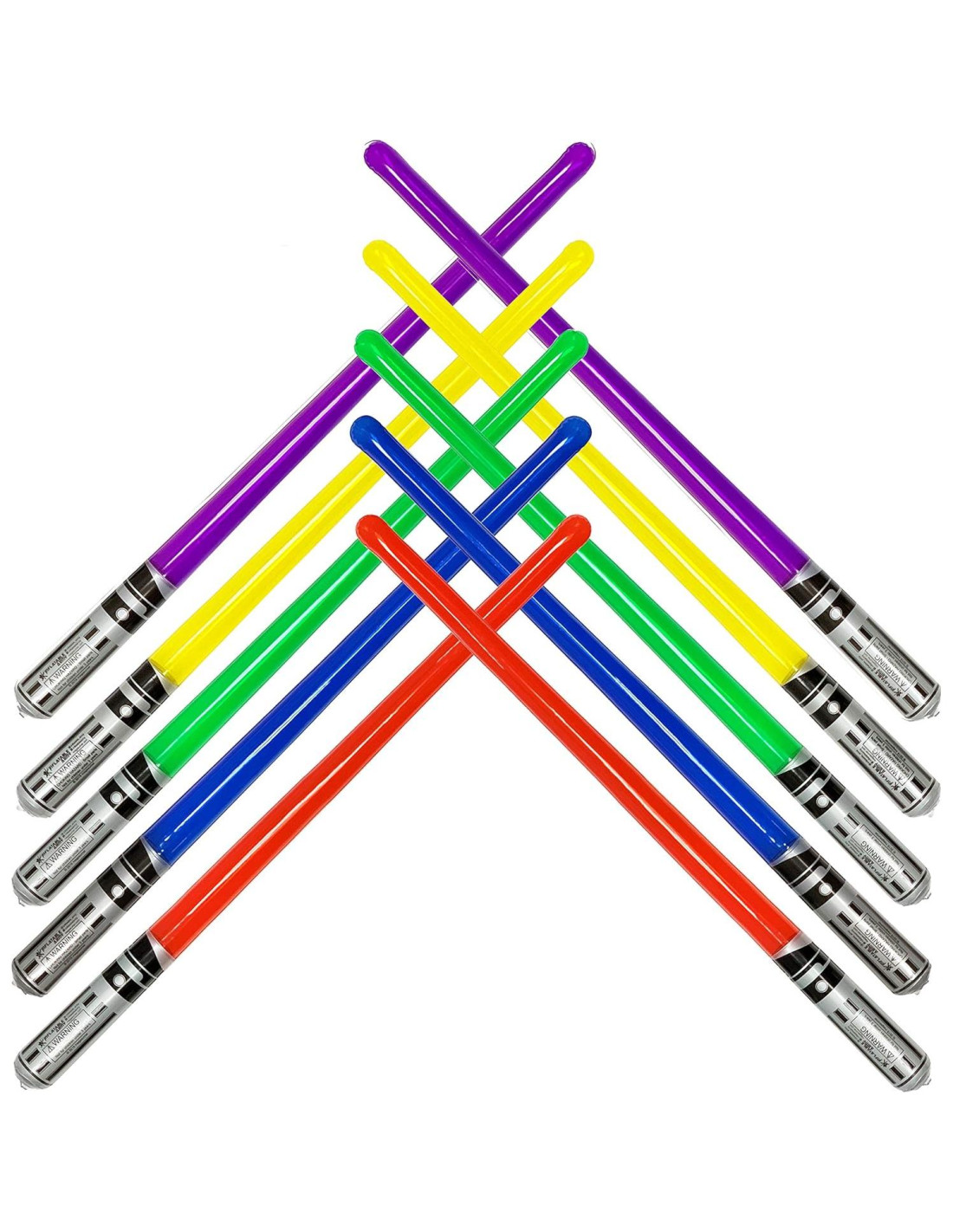 50 espadas inflables en total: 10 verdes, 10 azules, 10 rojas, 10 púrpuras, 10 amarillas. Las espadas miden aproximadamente 31" (78.74 cm) de largo cada una. Las hojas no iluminan. Bomba de aire incluida.