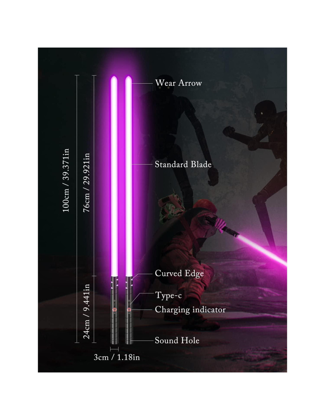 - [Sable de Luz 2-en-1] El conector permite combinar dos hojas en una espada de doble filo, siendo tanto la hoja como el mango desmontables. La hoja del sable de luz RGB jvmuSaber está hecha de PC duradero y tiene un mango de metal cepillado.