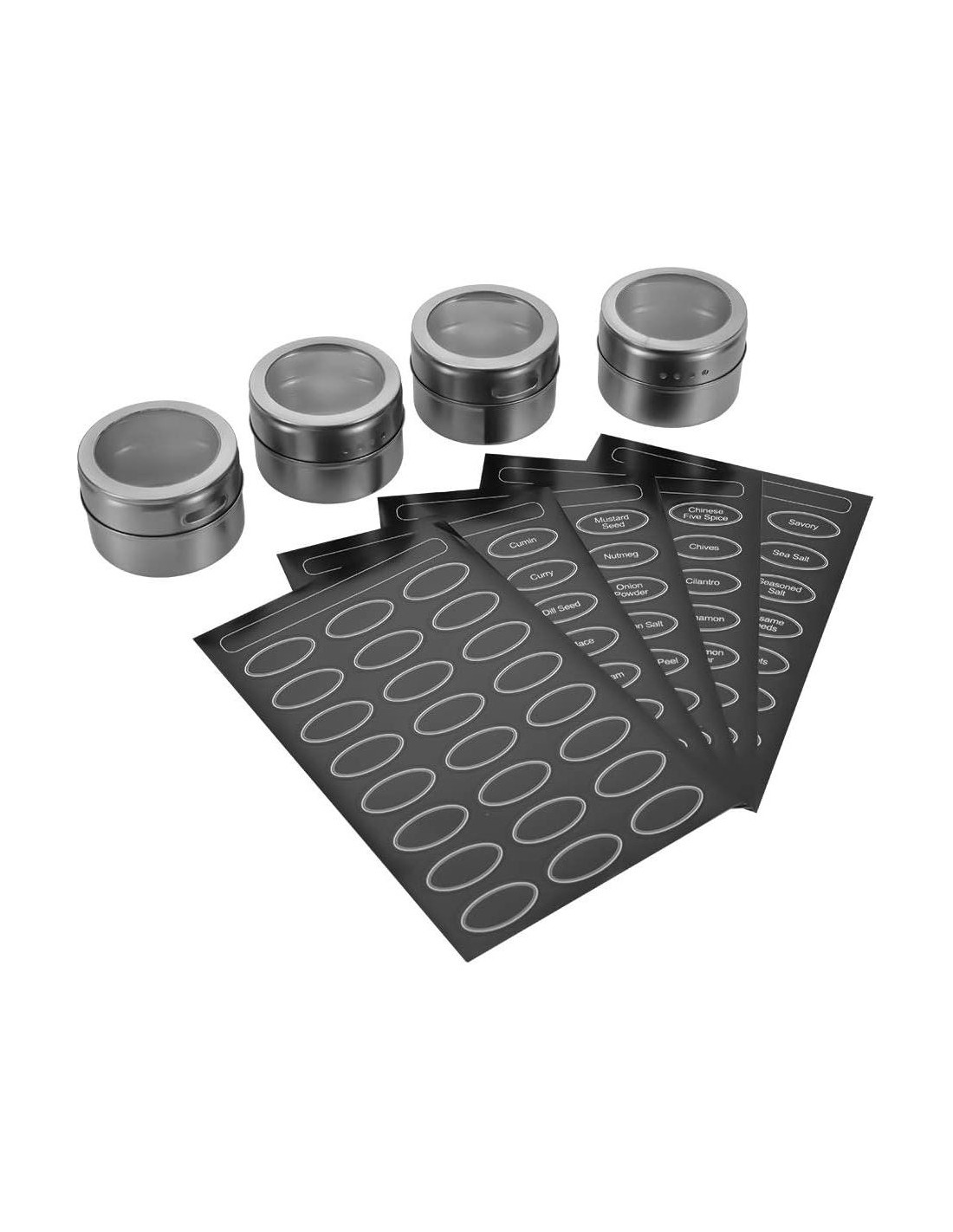 - Cada juego está equipado con 12 tarros de especias de acero inoxidable, con bordes seguros, 120 etiquetas de especias de molienda en frío dentro del tarro.