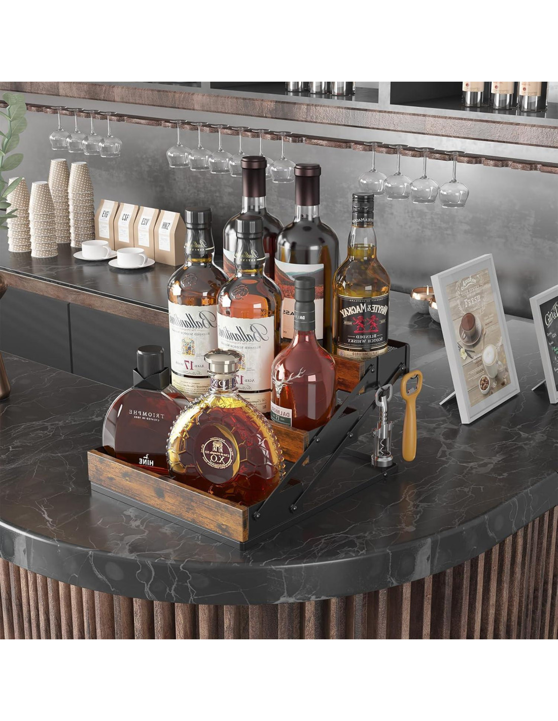 - 4. Amplia aplicación: Este elegante estante de especias de 3 niveles de KOKSTOP se puede colocar en cualquier lugar que elijan sus clientes, incluyendo, pero no limitado a, gabinetes, encimeras, cafeterías, oficinas, salas de estar, cocinas, etc. para organizar botellas de condimentos necesarias, jarabes de café, botellas de vino y otros artículos para optimizar el espacio en la encimera de los clientes.