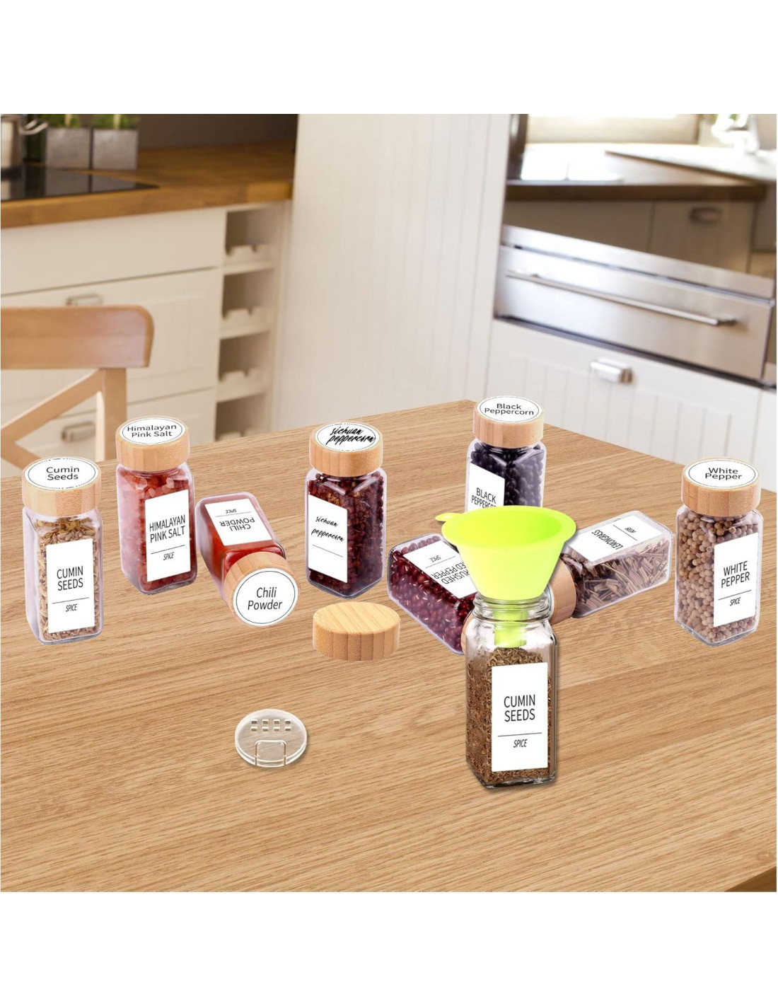 - JUEGO DE TARROS DE ESPECIAS CON ETIQUETAS: 24 tarros de especias vacíos, 24 tapas de dosificador de plástico, 24 tapas de bambú natural, 2 tipos de etiquetas de tarros de especias impermeables, 1 embudo de silicona, 1 marcador de tiza blanca. Cada tarro de especias cuadrado mide aproximadamente 1.8"W x 4.1"H (4.6 cm x 10.4 cm), capacidad de 4 onzas líquidas (118 ml).
