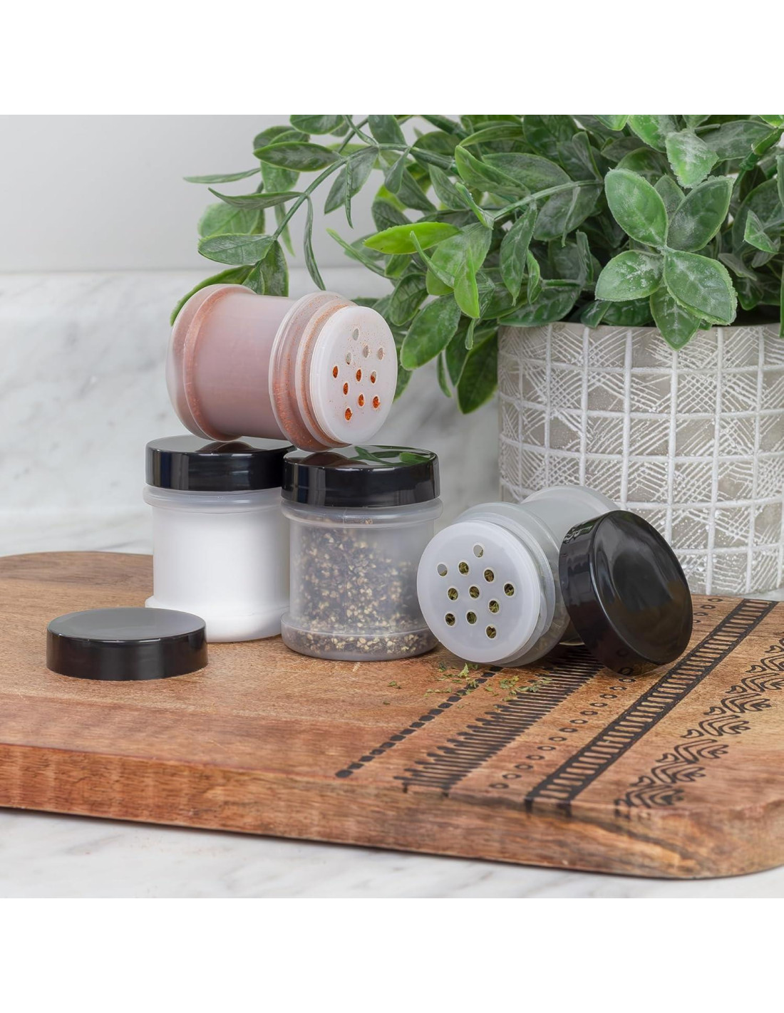 - JUEGO DE VALOR DE 12: Recibe una docena de frascos de especias de plástico vacíos, cada uno con insertos de tamiz y tapas