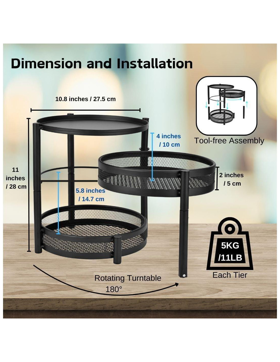 - Bandeja giratoria para fácil acceso: El segundo nivel cuenta con una bandeja giratoria de 11 pulgadas (27,94 cm) de giro suave con un diseño de patas único para garantizar estabilidad y prevenir vuelcos, proporcionando fácil acceso a todos tus artículos.