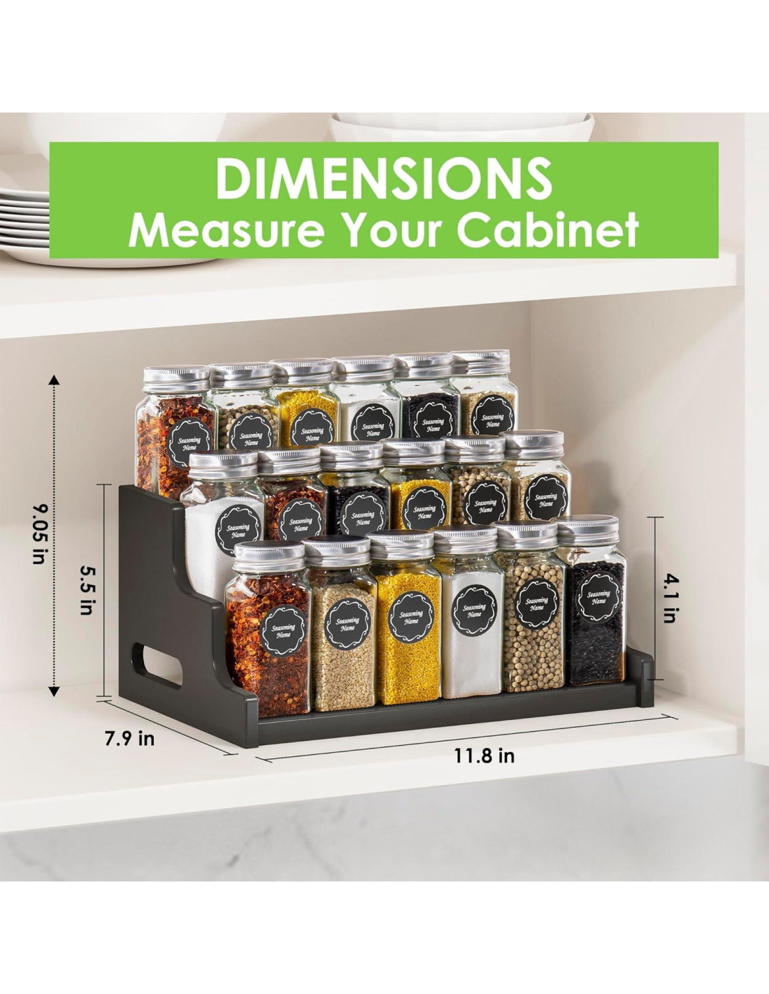 - Dimensiones: 11.8x 7.9x 5.5 pulgadas (30 cm x 20 cm x 14 cm) (L x A x A). 3 niveles en total, adecuado para frascos y botellas de especias, bebidas, salsas, frascos de gelatina, botellas de vitaminas y medicamentos. El tamaño del frasco de especias es: 1.65x 4.1 pulgadas (4,19 cm x 10,41 cm) (A*H). Por favor, mide el tamaño de tu gabinete antes de comprar.