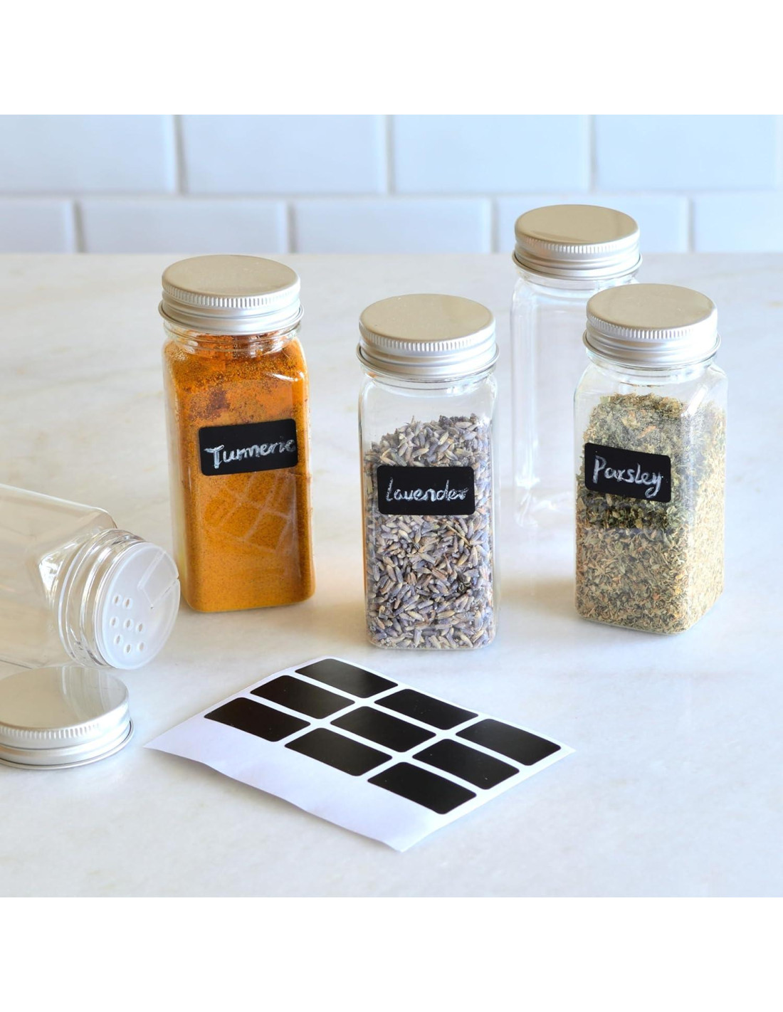 - Tarros de Especias de Plástico MEJOR VALOR - Total 12 Paquete 4 Onzas Contenedores de Especias Transparentes con tapas de agitador y tapas herméticas, vienen con 1 embudo y etiquetas adicionales