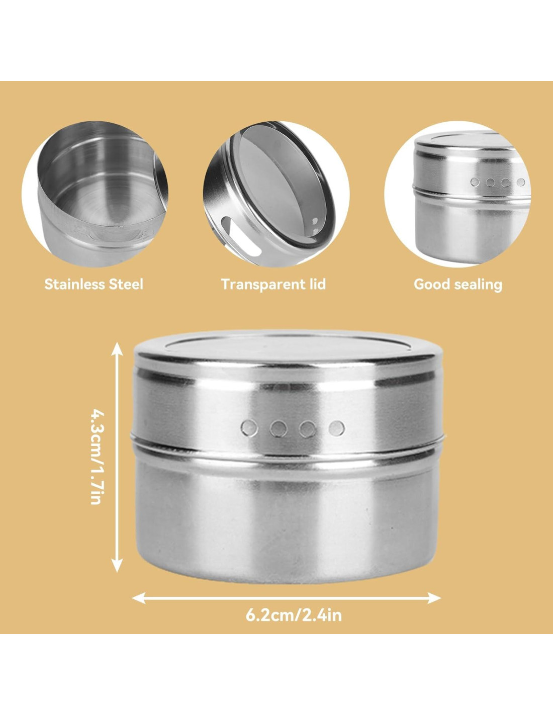 - PRÁCTICO: Recibirás 6 tarros de especias magnéticos, 6.1x6.1x4.3cm, los tarros magnéticos tienen una tapa que puede mantener tus especias secas y limpias, y la base de acero inoxidable se puede fijar donde desees.
