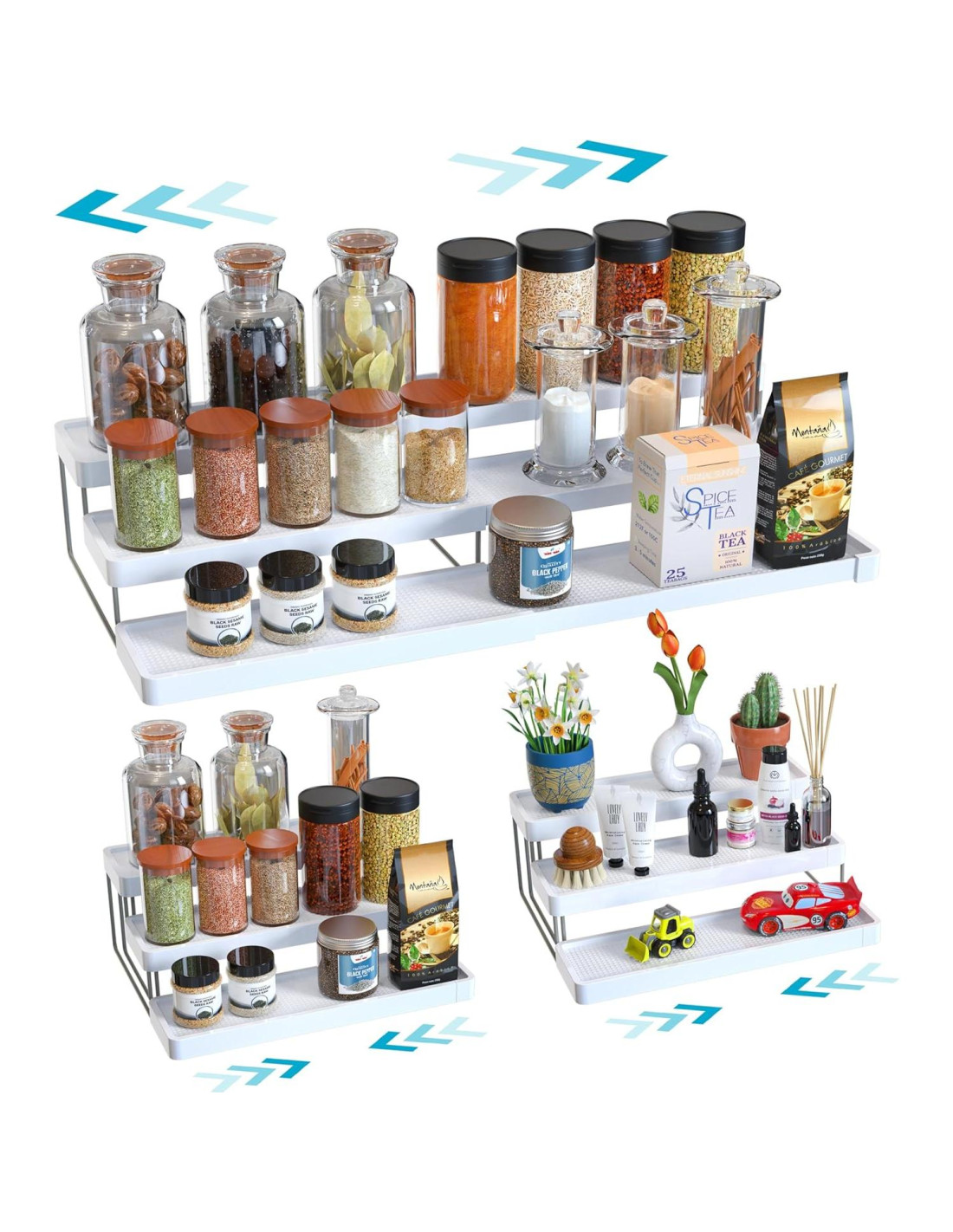 - Estante de Especias Expandible y Organizador de Condimentos: Con un diseño expandible, este estante de especias y organizador de condimentos se adapta perfectamente en tu organizador de latas de despensa, ofreciendo una solución de organizador de almacenamiento de 3 niveles para productos enlatados.