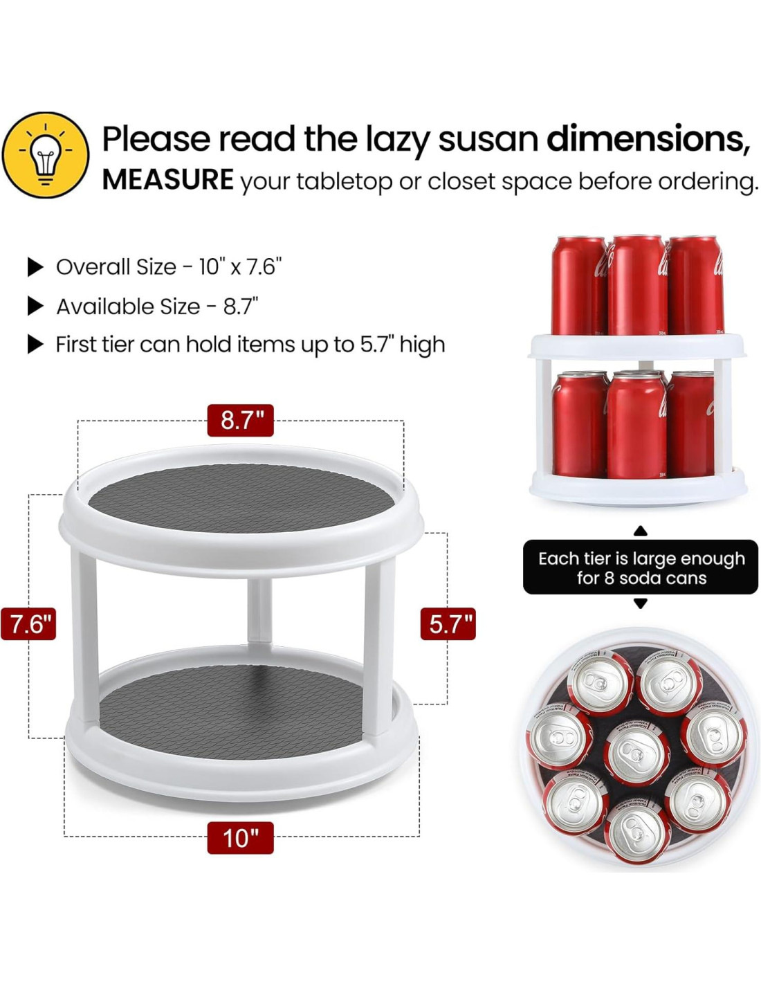 - [ Nota ] - Cada nivel de los lazy susans de 2 niveles es lo suficientemente grande para 8 latas de soda (ver la 2da imagen). Por favor, lea las dimensiones del lazy susan y mida su espacio de mesa o armario antes de ordenar en caso de que no quepa. MEDIDAS: Tamaño total - 10" x 7.6" (25,4 cm x 19,3 cm). Tamaño disponible - 8.7" (22,1 cm). El primer nivel puede sostener artículos de hasta 5.7" (14,5 cm) de alto