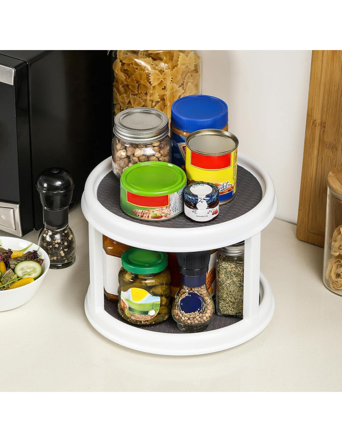 - Incluye producto - 1 paquete de lazy susans de plástico antideslizante de dos niveles de 10 pulgadas (25,4 cm). Superficie de silicona en forma de diamante antideslizante con pies de base antideslizante.