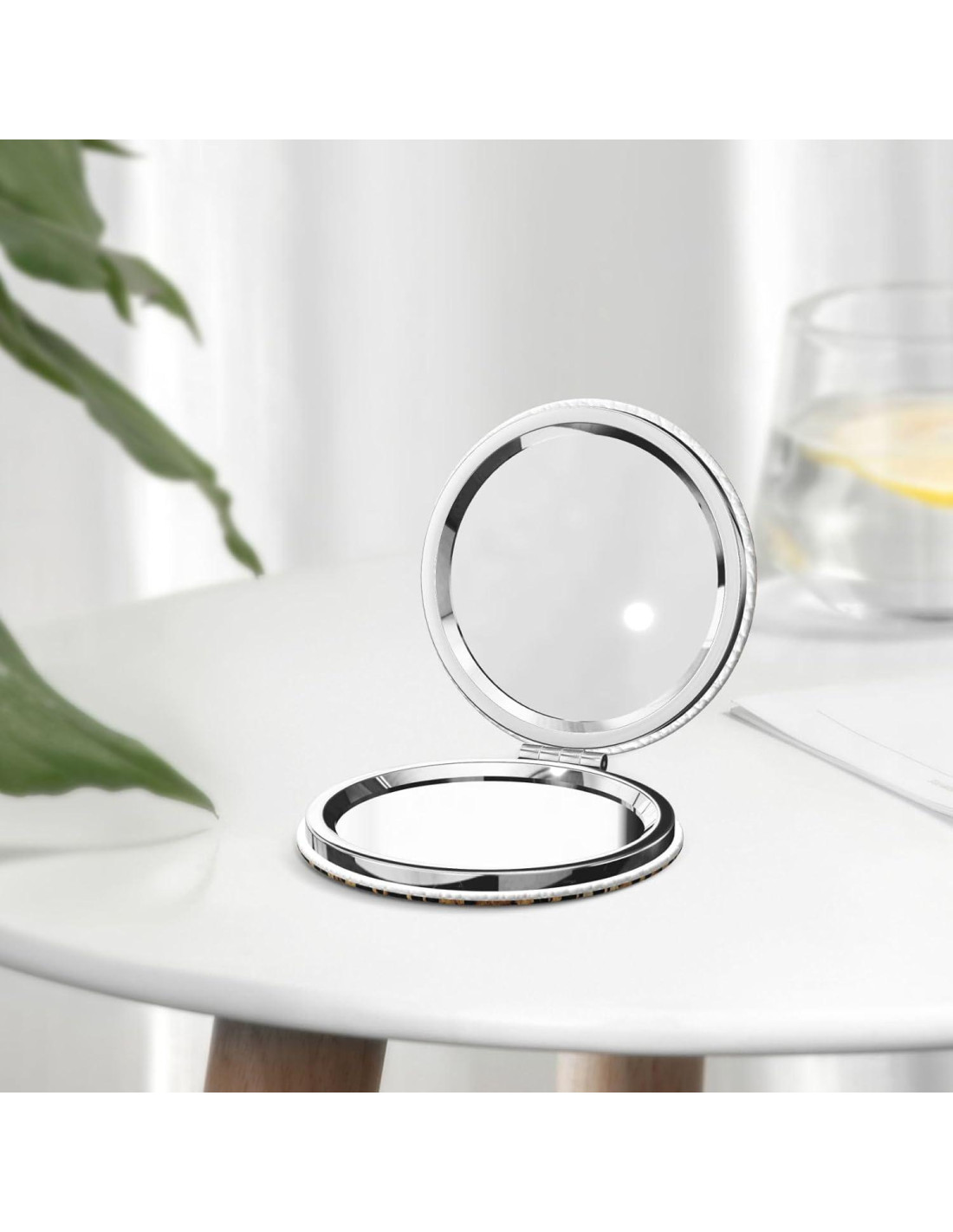 - Este espejo de bolsillo muestra completamente elegancia, solidez, compacidad, ligereza, simplicidad y modernidad. El pequeño espejo se puede abrir a 180 para colocación plana o mantener en cualquier ángulo que desees