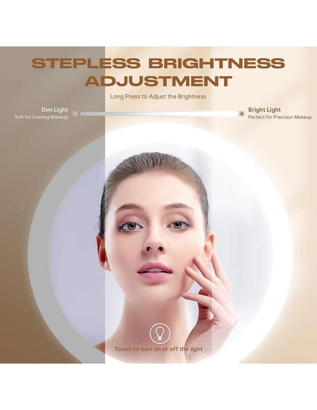 - [3 Colores de Luz y Brillo Sin Escalones] El espejo de tocador con luces tiene 60 perlas de lámpara LED de alta luminosidad incorporadas, tira de luz LED circundante con tres niveles de brillo ajustables (luz fría/luz cálida/luz natural), simula diferentes escenarios de iluminación (como luz diurna, oficina, fiesta) para asegurar un maquillaje natural y perfecto todo el día. La luz es suave y puede cubrir todas las esquinas de tu rostro. Presiona brevemente el interruptor del sensor para cambiar el color de la luz, mantén presionado para ajustar el brillo de la luz, satisfaciendo todas tus necesidades en diferentes entornos.