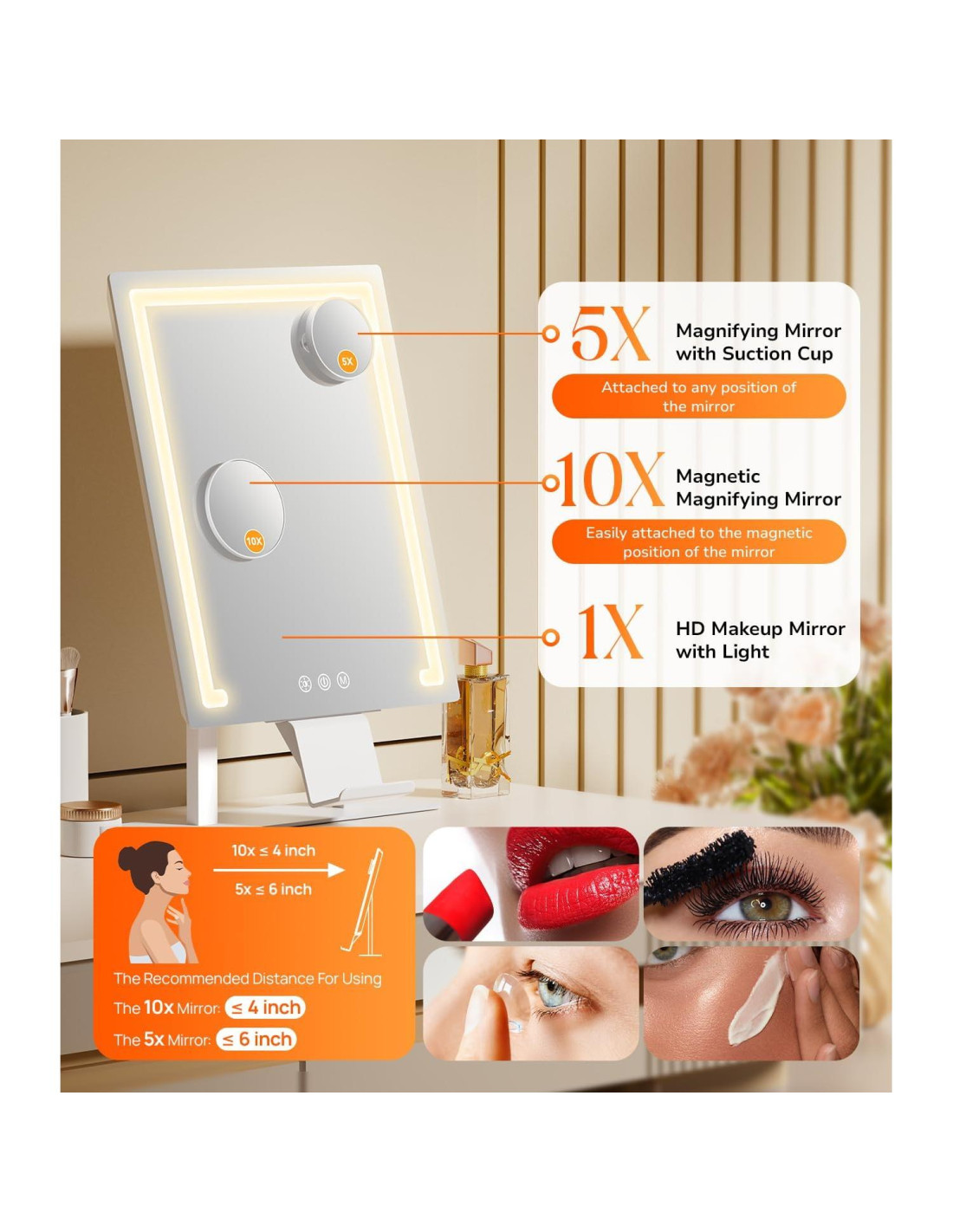 - Espejo de Aumento Desmontable 5X/10X: El espejo 5X cuenta con un diseño de ventosa que se adhiere de forma segura a cualquier posición del espejo, mientras que el espejo 10X tiene un imán incorporado y puede ser colocado en cualquier posición magnética del espejo. El espejo de aumento te permite concentrarte en los detalles de tu rostro para lograr un maquillaje impecable, adecuado para uso en casa o en el trabajo.