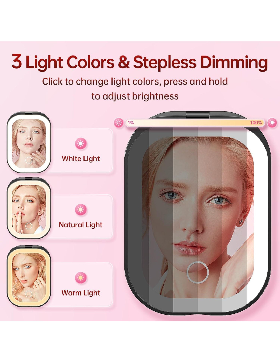 - Cierre Magnético y Función de Memoria El mini espejo se puede abrir y cerrar fácilmente mediante un cierre magnético, y la luz se apagará automáticamente al cerrarse. También tiene una función de memoria inteligente, que te permite acceder a tu color de luz y configuración de brillo anteriores cuando enciendes las luces la próxima vez